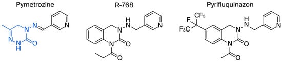 Pymetrozine (Figure 1), a triazone insecticide discovered by Syngenta in 1988, exhibited good activities against aphids, white flies, and planthoppers [4]. Since then, such insecticides have attracted great research attention for decades [5,6,7,8,9,10,11]. Our previous studies have also indicated that triazone derivatives containing phenoxypyridine, urea, sulfonamide or sulfonimide, acylhydrazone display significant insecticidal properties [12,13,14,15]. However, only two other commercial insecticides (R-768 and pyrifluquinazon, Figure 1) have been developed so far, the activities of which are significantly lower than that of pymetrozine [16].