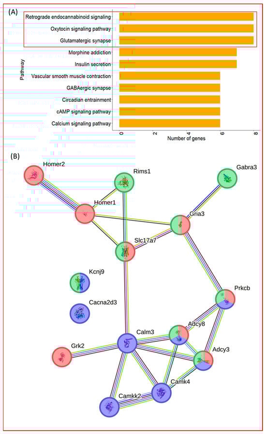To determine which neuronal signaling pathways were most prominently represented within the neuronal gene set, pathway-specific mapping was performed for the 44 neuronal-related genes. Among the pathways examined, three KEGG signaling pathways contained the highest number of mapped genes: the glutamatergic synapse, oxytocin signaling, and retrograde endocannabinoid signaling (