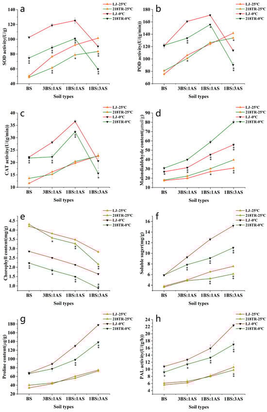 Physiological indices of alfalfa cultivars LJ (pink line) and 218TR (green line) exposed to different saline–alkaline and cold stresses. The 25 °C treatments for both cultivars are represented by upright arrows, and the 0 °C treatments by inverted arrows. Leaf tissues were used to analyze SOD, POD, CAT, and PAL activities as well as MDA, chlorophyll, soluble sugar, and proline contents. BS, black soil; AS, alkaline soil. (a): SOD activity, (b): POD activity, (c): CAT activity, (d): MDA content, (e): chlorophyll content, (f): soluble sugar content, (g): proline content, (h): PAL activity. Data are presented as the mean ± SE from three replicates. Asterisks indicate significant differences as determined by Student’s t-test (* 0.01 < p < 0.05, ** p < 0.01).