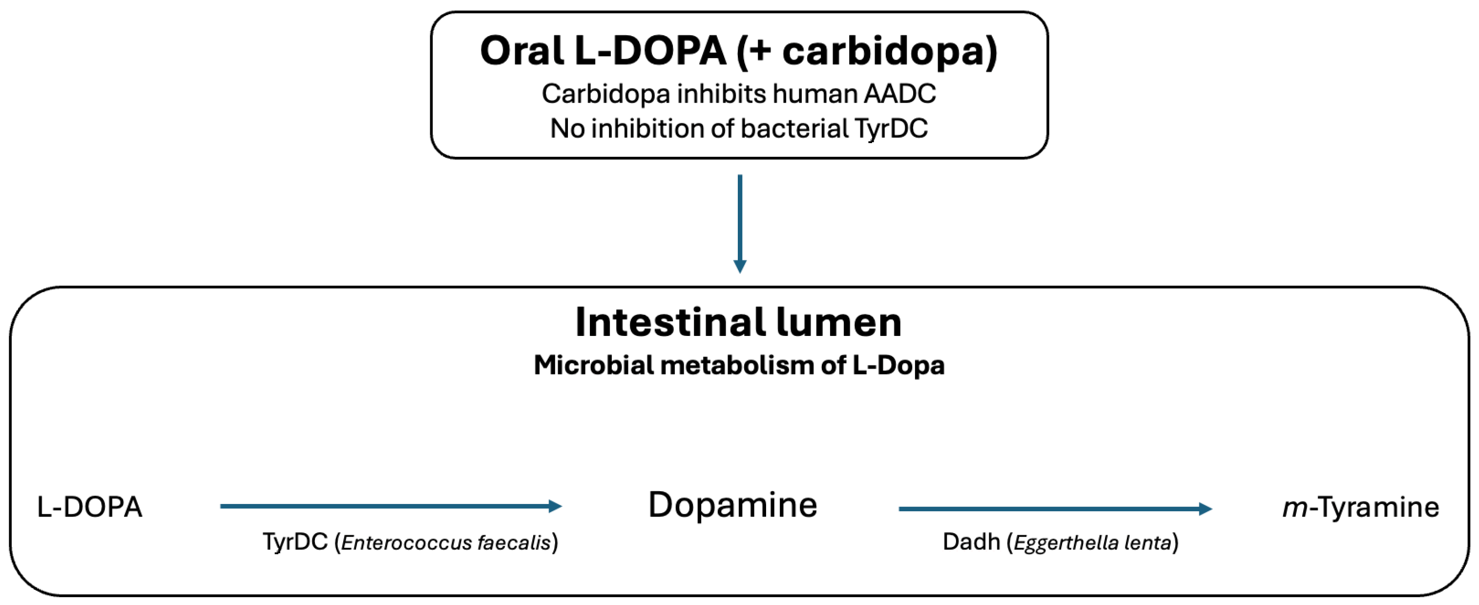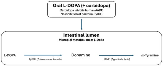 | Microbiota-derived pathways | (i) Enterococcus faecalis TyrDC: L-DOPA → dopamine; (ii) Eggerthella lenta Dadh: dopamine → m-tyramine | Potential alteration of luminal catecholamine exposure; reduces L-DOPA availability | Science 2019 [8]; eLife 2020 [9]; Nat. Commun. 2019 [10] |