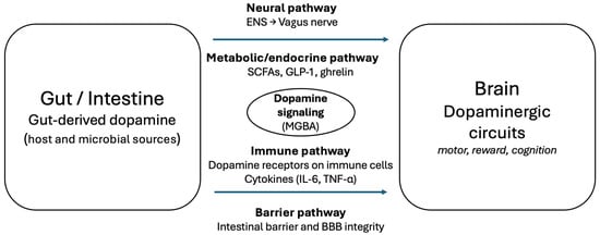 - Hamamah, S.; Aghazarian, A.; Nazaryan, A.; Hajnal, A.; Covasa, M. Role of Microbiota-Gut-Brain Axis in Regulating Dopaminergic Signaling. Biomedicines 2022, 10, 436. [Google Scholar] [CrossRef]