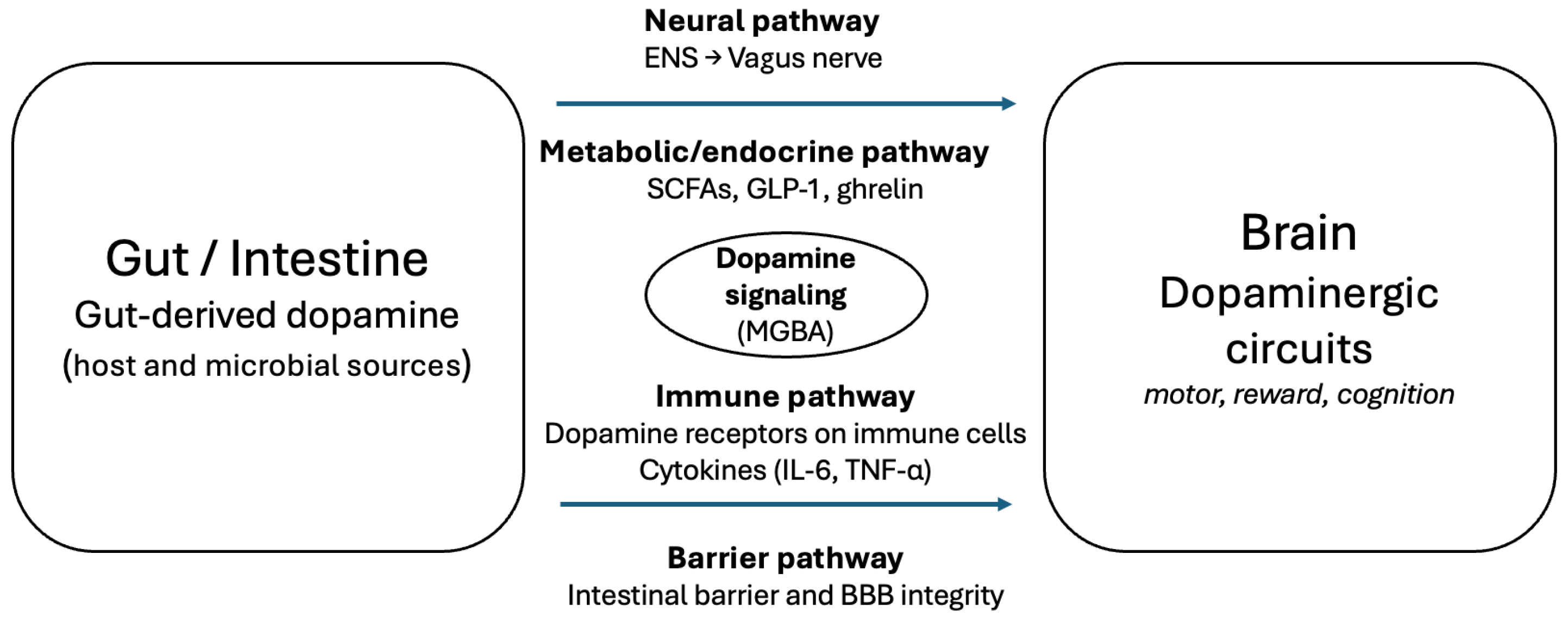 | Neural (ENS and vagus nerve) | Dopamine modulates enteric neurons and vagal afferents; vagotomy abolishes microbial effects | Germ-free and vagotomy animal models | Links gut dopamine to central motor and reward circuits |