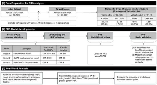 Schematic diagram of the study design, including data preparation, PRS model development process, and clinical analysis. Abbreviations: KoGES, Korean Genome and Epidemiology Study; PRS, Polygenic Risk Score; DM, Type 2 Diabetes Mellitus; GWAS, Genome-Wide Association Study; LD, Linkage Disequilibrium; PLINK, GWAS analysis software [19]. All arrows indicate the sequential workflow of the analysis.