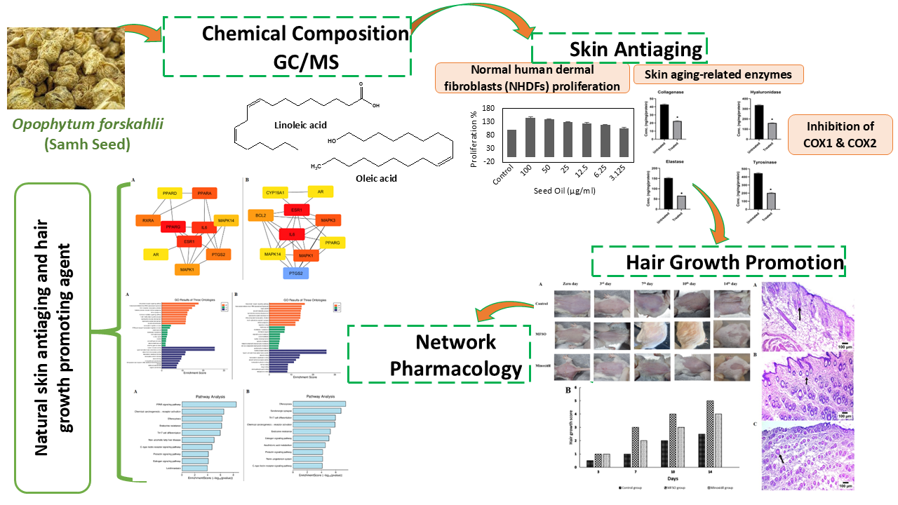 Ahmed, S.R.; Khojah, H.; Aldera, M.; Alsarah, J.; Alwaghid, D.; Hamdan, L.; Aljuwair, H.; Alshammari, M.; Albalawi, H.; Aldekhail, R.; et al. Deciphering the Skin Anti-Aging and Hair Growth Promoting Mechanisms of Opophytum forskahlii Seed Oil via Network Pharmacology. Int. J. Mol. Sci. 2026, 27, 277. https://doi.org/10.3390/ijms27010277