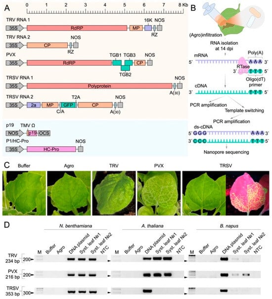 Recombinant binary plasmids based on TRV1, TRV2, TRV2:P19, PVX, TRSV1, and TRSV2 were introduced into the Agrobacterium tumefaciens GV3101 strain by electroporation. Colonies were grown on solid LB with appropriate antibiotics at 28 °C for approximately 48 h, transferred to liquid LB, and cultured to OD600 1.0–1.5. Cells were harvested (3500× g, 10 min), resuspended in infiltration buffer (10 mM MES, pH 5.6; 10 mM MgCl2; 100 µM acetosyringone), and incubated at room temperature for 2–3 h before infiltration. Nicotiana benthamiana (5–6-leaf stage; OD600 adjusted to 1.0), Arabidopsis thaliana (4–5-leaf stage; OD600 1.5), and Brassica napus (4–5-leaf stage; OD600 1.0) were infiltrated on the abaxial leaf side using needleless syringes. For TRV and TRSV, separate cultures of TRV1 and TRV2, or TRSV1 and TRSV2, were mixed 1:1 immediately before infiltration. PVX was infiltrated as a single construct. For all treatments described above, infiltration mixtures were supplemented with agrobacterial suspensions harboring p19 and P1/HC-Pro expression plasmids (each at 5% of the final suspension volume) to minimize RNA silencing. In a separate experiment, N. benthamiana (5–6-leaf stage; OD600 1.0) was infiltrated with mixtures of separate cultures carrying TRV1 and TRV2 (1:1) or TRV1 and TRV2-P19 (1:1). Following infiltration, plants were maintained at 22 °C under a 16/8 h light/dark cycle. Fourteen days post-infiltration, apical systemic leaves were immediately collected, quickly frozen in liquid nitrogen, and stored at −80 °C for downstream analyses.