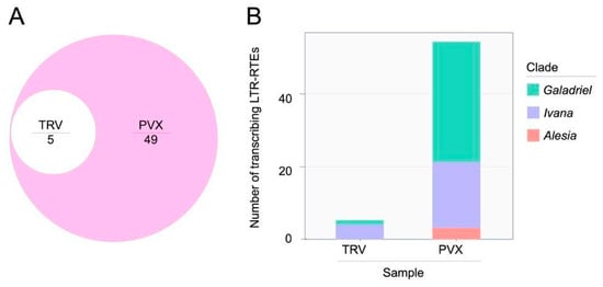 Analysis of N. benthamiana LTR-RTEs transcribing under viral infection. (A) Euler diagram showing the overlap of transcribed LTR-RTEs in N. benthamiana samples. (B) Stacked bar chart illustrating the number and clade classification of transcribed LTR-retrotransposons detected across two sample conditions: TRV and PVX. Bars are subdivided by color to indicate contributions from three phylogenetic clades: Galadriel (turquoise), Ivana (violet), and Alesia (red).