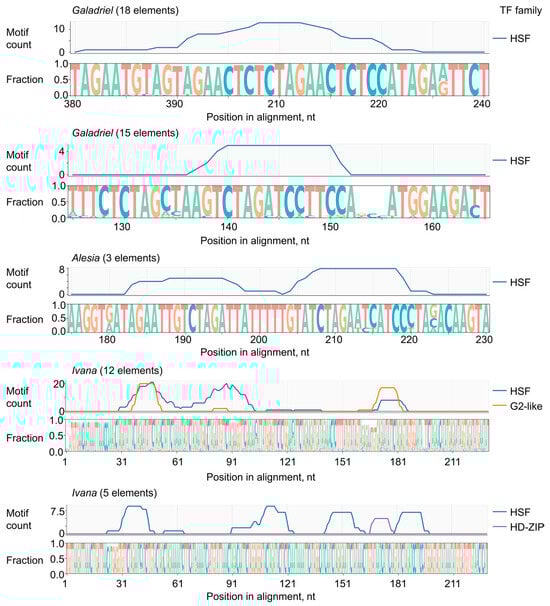 We next analyzed the LTR sequences of actively transcribed LTR-RTEs to identify potential transcription factor binding sites. LTR sequences were extracted from all transcribed elements, except for one Ivana element that lacked identifiable LTRs. Representative LTRs from each clade were aligned, with Galadriel and Ivana elements further subdivided into two subgroups due to sequence divergence. Consensus sequences were generated for each of the five resulting alignments (File S1), and candidate transcription factor binding motifs were identified using a significance cutoff of p < 1 × 10−4 (Table S9). We found a notable enrichment of N. benthamiana heat stress factor (HSF) recognition motifs in all active LTR-RTEs, including 4–10 HSF motifs in Galadriel elements, 8 in Alesia elements, and 8–20 in Ivana elements (Figure 4).