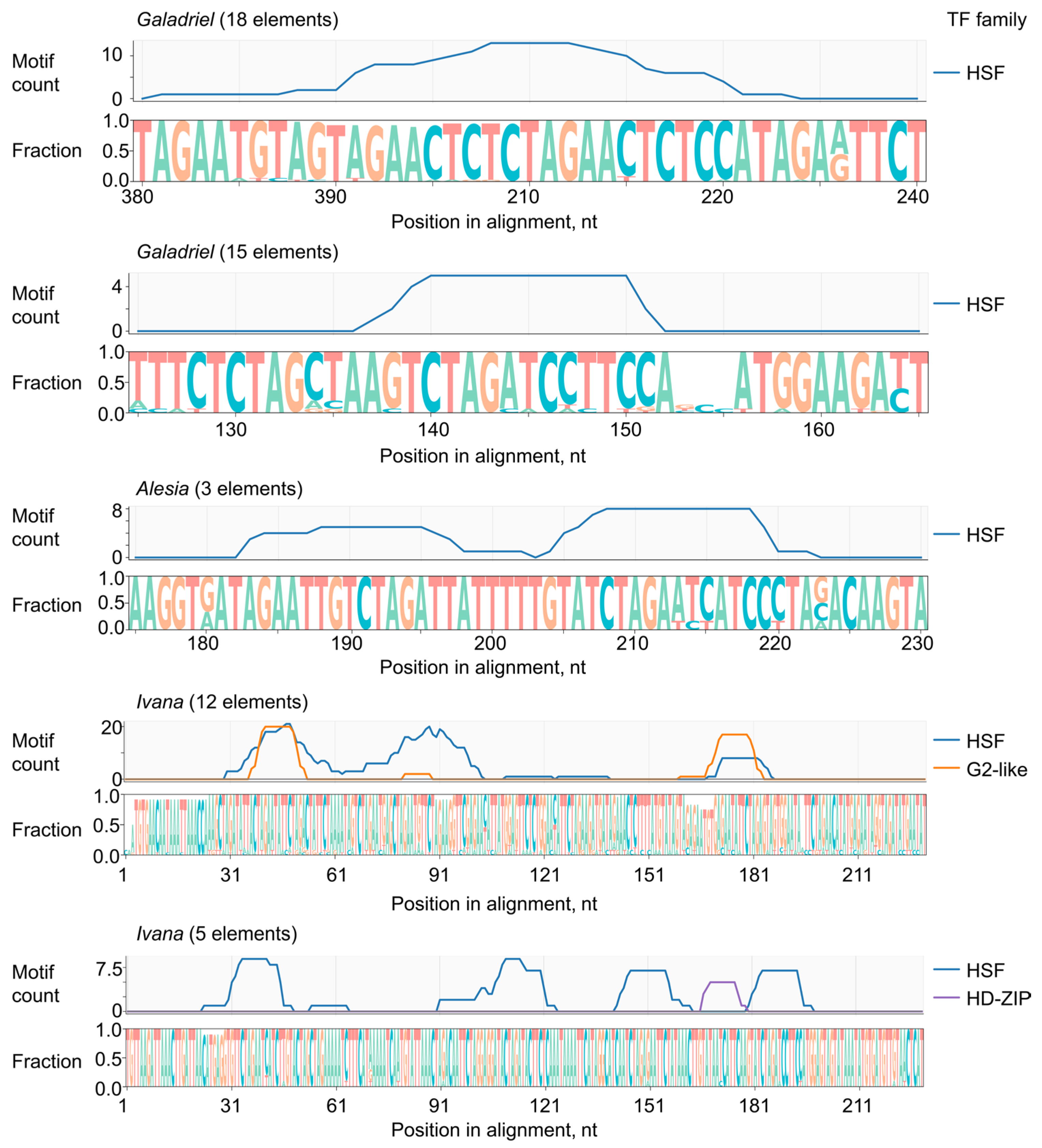 We next analyzed the LTR sequences of actively transcribed LTR-RTEs to identify potential transcription factor binding sites. LTR sequences were extracted from all transcribed elements, except for one Ivana element that lacked identifiable LTRs. Representative LTRs from each clade were aligned, with Galadriel and Ivana elements further subdivided into two subgroups due to sequence divergence. Consensus sequences were generated for each of the five resulting alignments (File S1), and candidate transcription factor binding motifs were identified using a significance cutoff of p < 1 × 10−4 (Table S9). We found a notable enrichment of N. benthamiana heat stress factor (HSF) recognition motifs in all active LTR-RTEs, including 4–10 HSF motifs in Galadriel elements, 8 in Alesia elements, and 8–20 in Ivana elements (Figure 4).