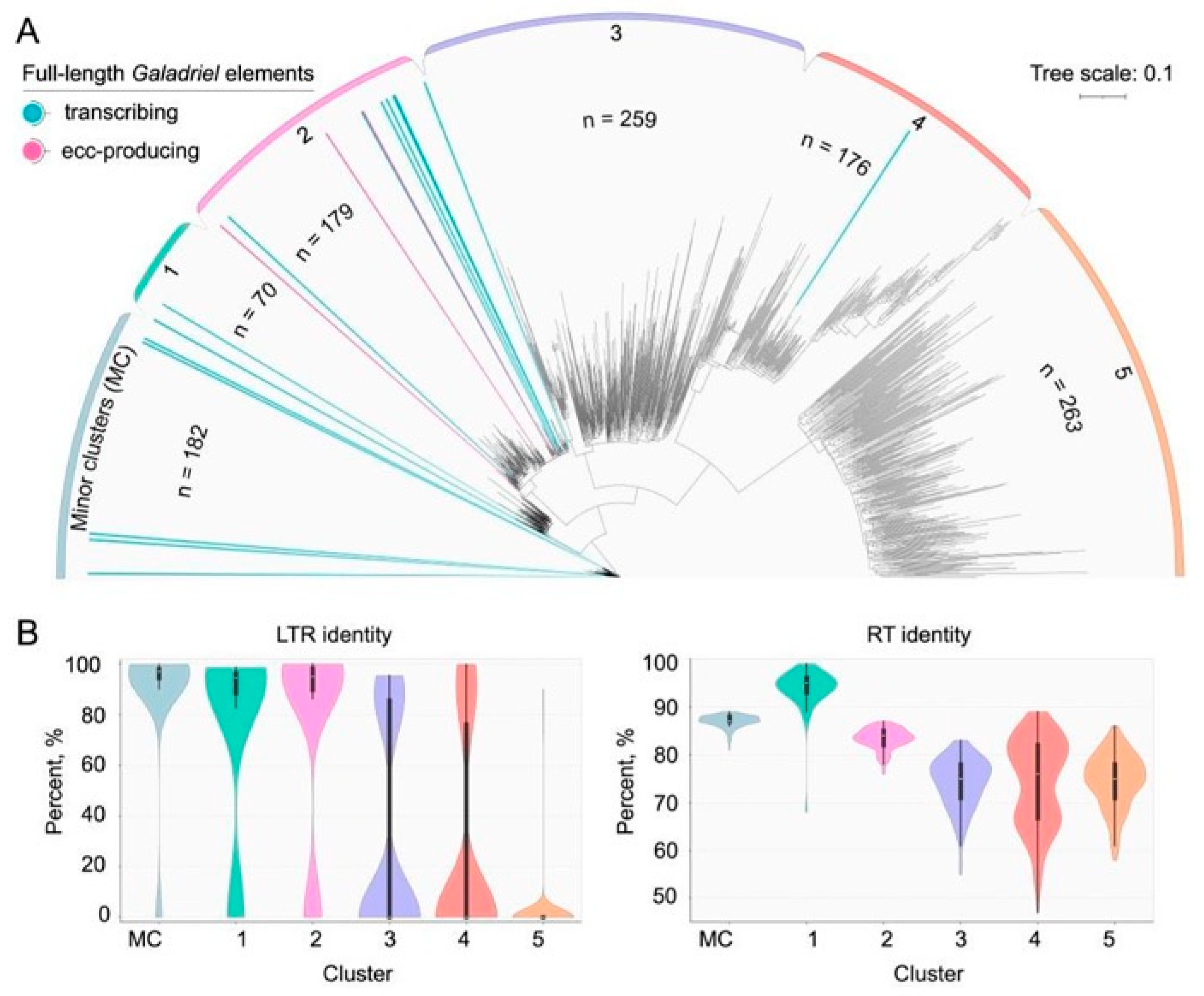 Figure 6. Phylogenetic analysis and characterization of Galadriel elements in NbT2T genome assembly. (A) Phylogenetic tree constructed based on reverse transcriptase (RT) sequences. Purple and turquoise lines indicate eccDNA-producing and transcribed LTR-RTs, respectively; the total number of elements in a cluster is denoted as “n”. (B) Violin plots characterizing representatives of individual clusters of the phylogenetic tree based on LTR and RT identity.