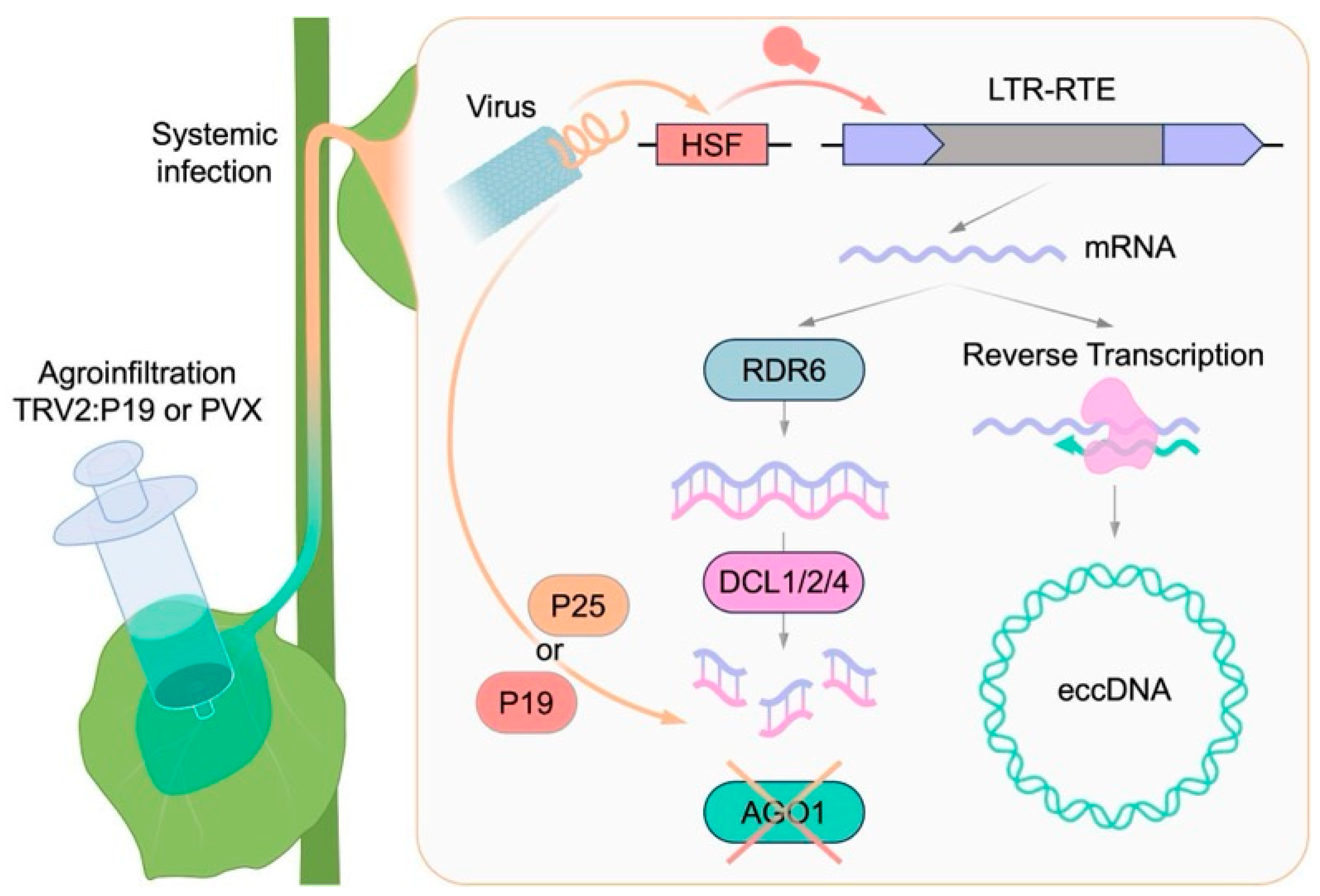 Figure 7. The proposed scheme for the observed virus-induced retrotransposition process in N. benthamiana.