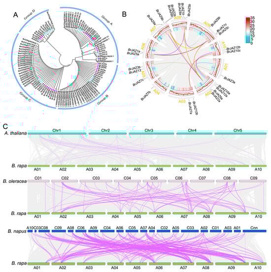 Phylogenetic and collinearity analysis of JAZ family members. (A) Phylogenetic relationships of JAZ proteins among B. rapa, A. thaliana, B. oleracea, and B. napus. (B) Collinearity analysis of BrJAZ genes within the B. rapa genome. (C) Synteny analysis of JAZ genes between B. rapa and three related species (A. thaliana, B. oleracea, and B. napus).