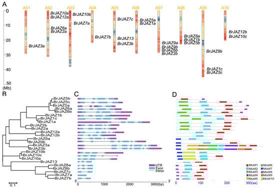 Chromosomal localization, phylogenetic tree, exon–intron structure, and conserved motifs of BrJAZ genes. (A) Chromosomal distribution of BrJAZ genes in B. rapa. (B) Phylogenetic tree of BrJAZ proteins. (C) Exon–intron structure of BrJAZ genes. (D) Conserved motifs in BrJAZ proteins.