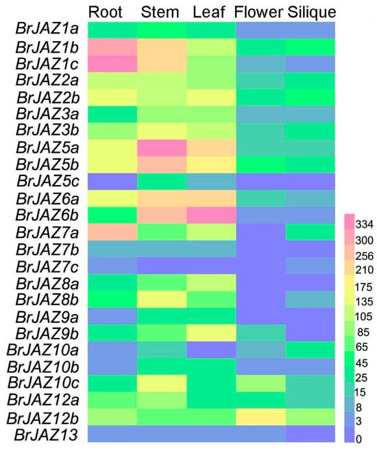 The expression levels of BrJAZ genes in different tissues (root, stem, leaf, flower, and silique) were analyzed using transcriptome data of Chinese cabbage from the BRAD database. Most BrJAZ genes exhibited relatively high expressions in root, stem, and leaf (Figure 4). BrJAZ5a, BrJAZ5b, BrJAZ6a, and BrJAZ6b were markedly induced in root and leaf, whereas BrJAZ1b and BrJAZ1c showed high transcript levels in root, stem, and leaf. In contrast, the expression levels of BrJAZ7b, BrJAZ7c, and BrJAZ13 were low across each tissue (Figure 4).