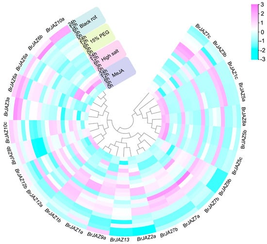 The transcriptional levels of BrJAZ genes in B. rapa under drought and high-salt stresses were further detected by qPCR at 0, 3, 6, 12, and 24 hours post-treatment (Figure 5). Under drought stress, nine members (BrJAZ1a, BrJAZ1b, BrJAZ2a, BrJAZ2b, BrJAZ6a, BrJAZ7a, BrJAZ7b, BrJAZ9a, and BrJAZ9b) were markedly induced, with peak expression levels generally observed at 3 h and 6 h. Among them, BrJAZ1a, BrJAZ1b, BrJAZ7a, and BrJAZ7b maintained notably high expression from 3 h to 24 h (Figure 5). Under high-salt stress, BrJAZ1a, BrJAZ1b, BrJAZ2a, and BrJAZ9a were strongly induced at 24 h, whereas BrJAZ2b was up-regulated at the earlier time points of 3 h and 6 h (Figure 5). Furthermore, the expression of BrJAZ1a, BrJAZ6a, BrJAZ6b, BrJAZ10a, and BrJAZ10b was significantly enhanced by both MeJA treatment and black rot pathogen infection. In contrast, BrJAZ2a and BrJAZ9a were induced specifically by MeJA at 24 h, and BrJAZ3a was specifically up-regulated in response to black rot infection (Figure 5).