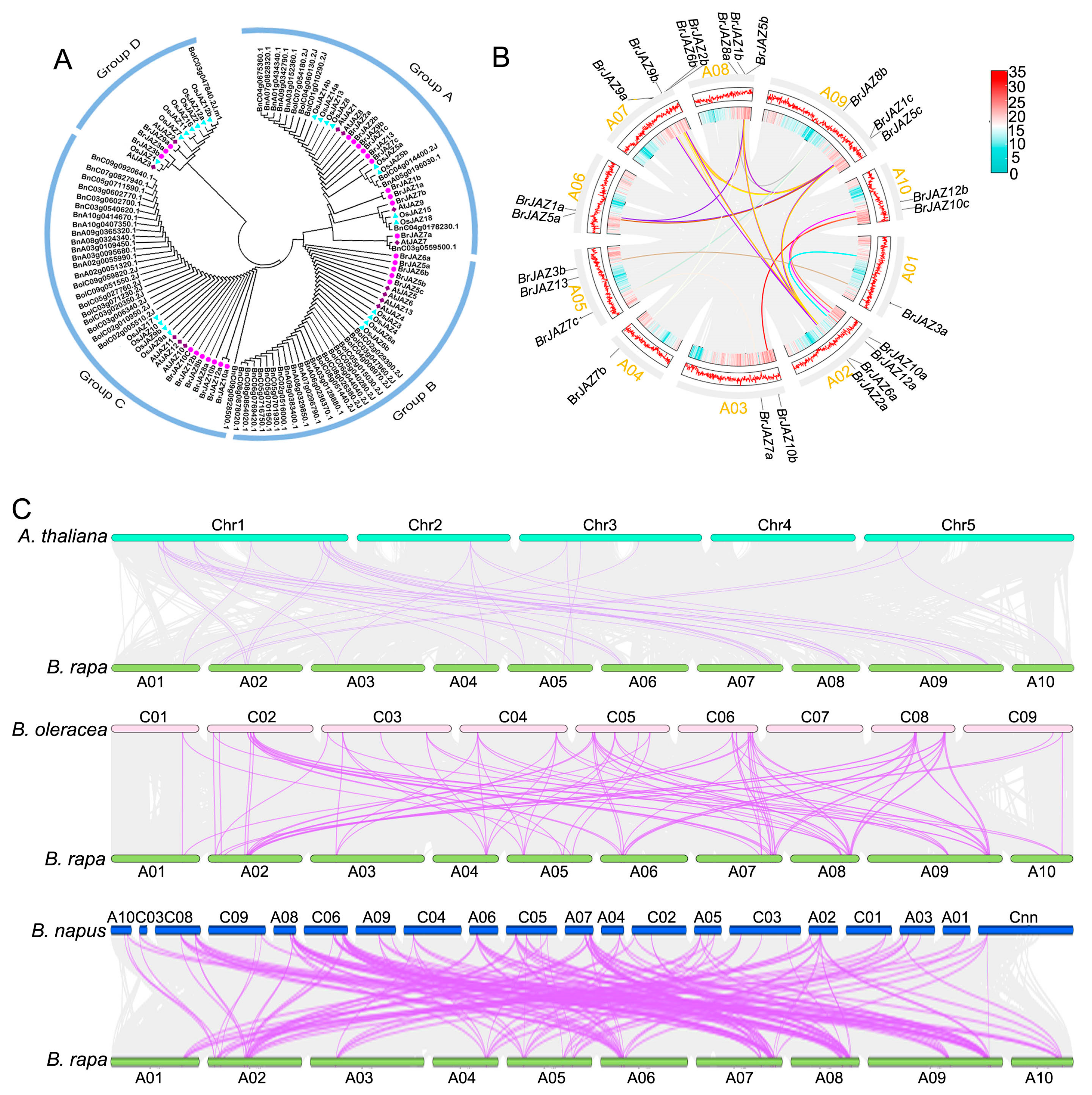 2.2. Phylogenetic Relationships and Synteny of JAZ Members Among B. rapa, A. thaliana, B. napus, and B. oleracea