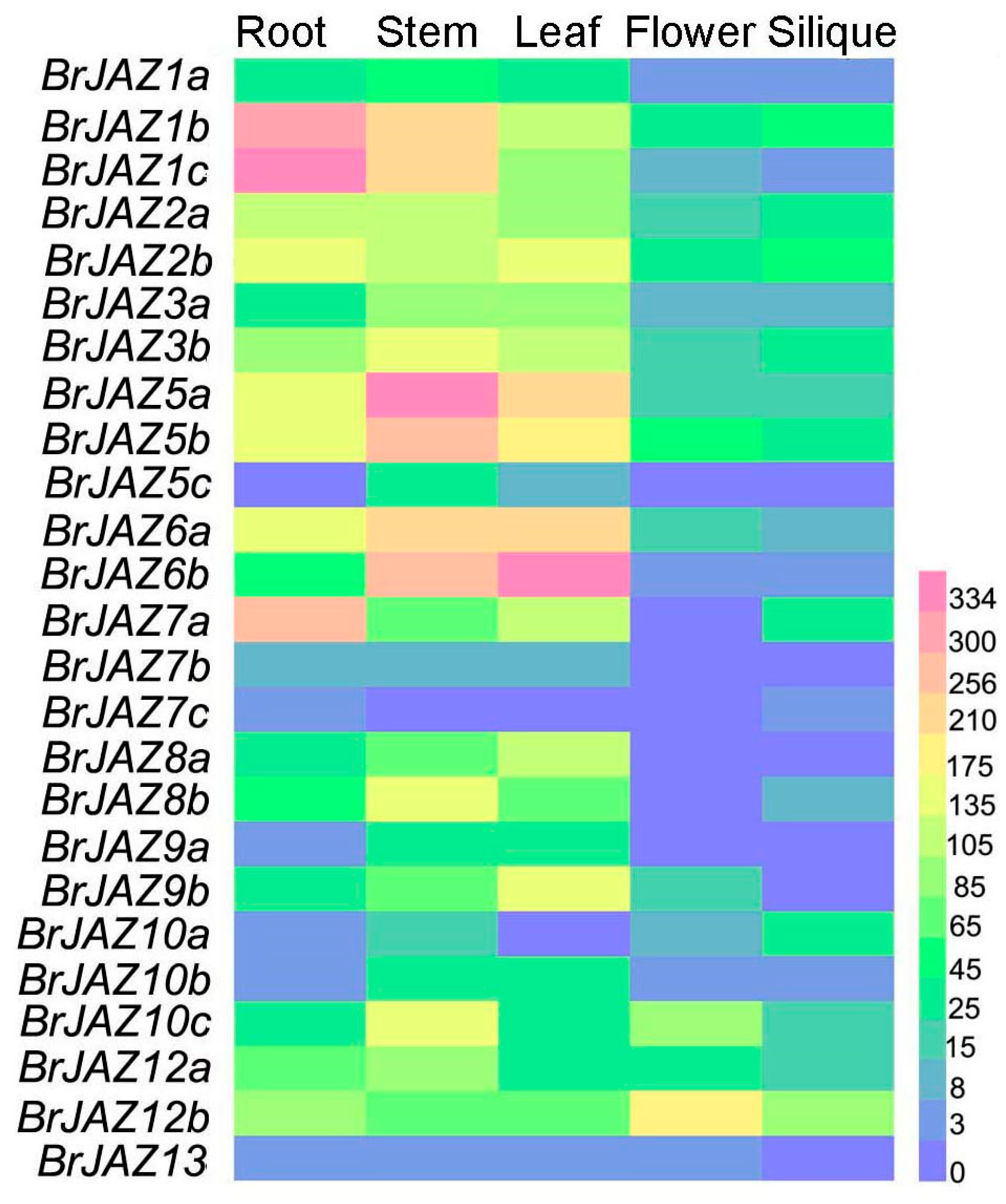 - Cai, Z.; Chen, Y.; Liao, J.; Wang, D. Genome-wide identification and expression analysis of jasmonate ZIM domain gene family in tuber mustard (Brassica juncea var. tumida). PLoS ONE 2020, 15, e0234738. [Google Scholar] [CrossRef] [PubMed]