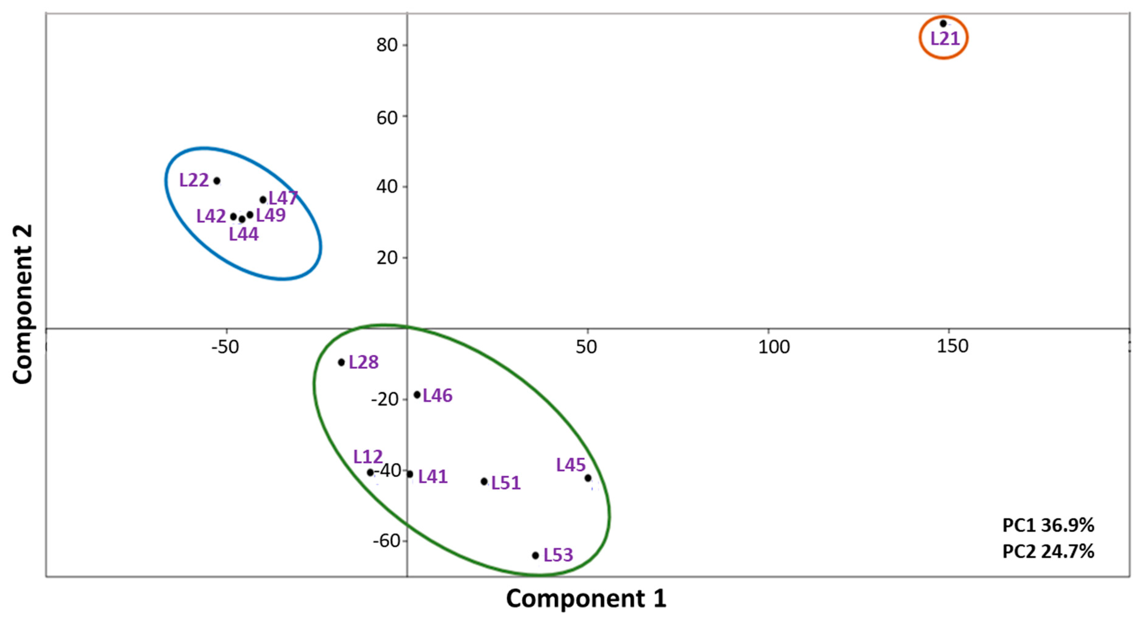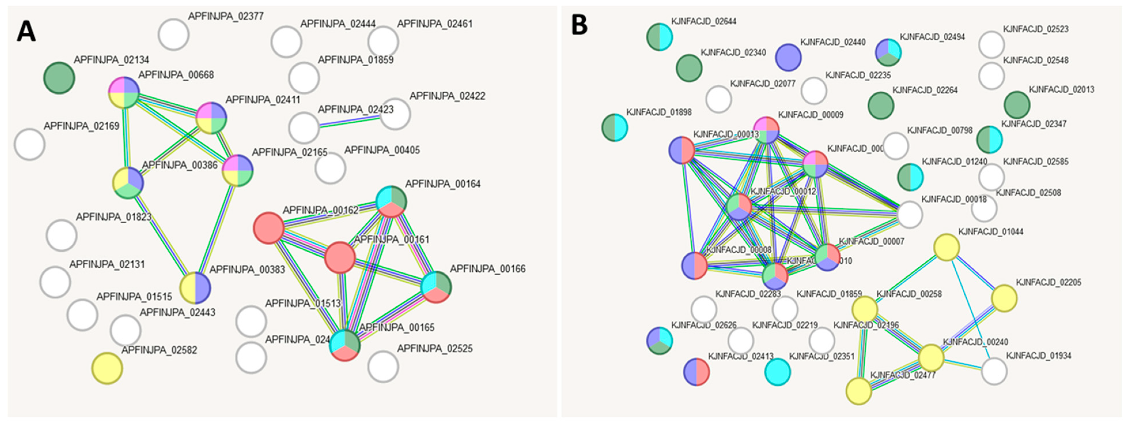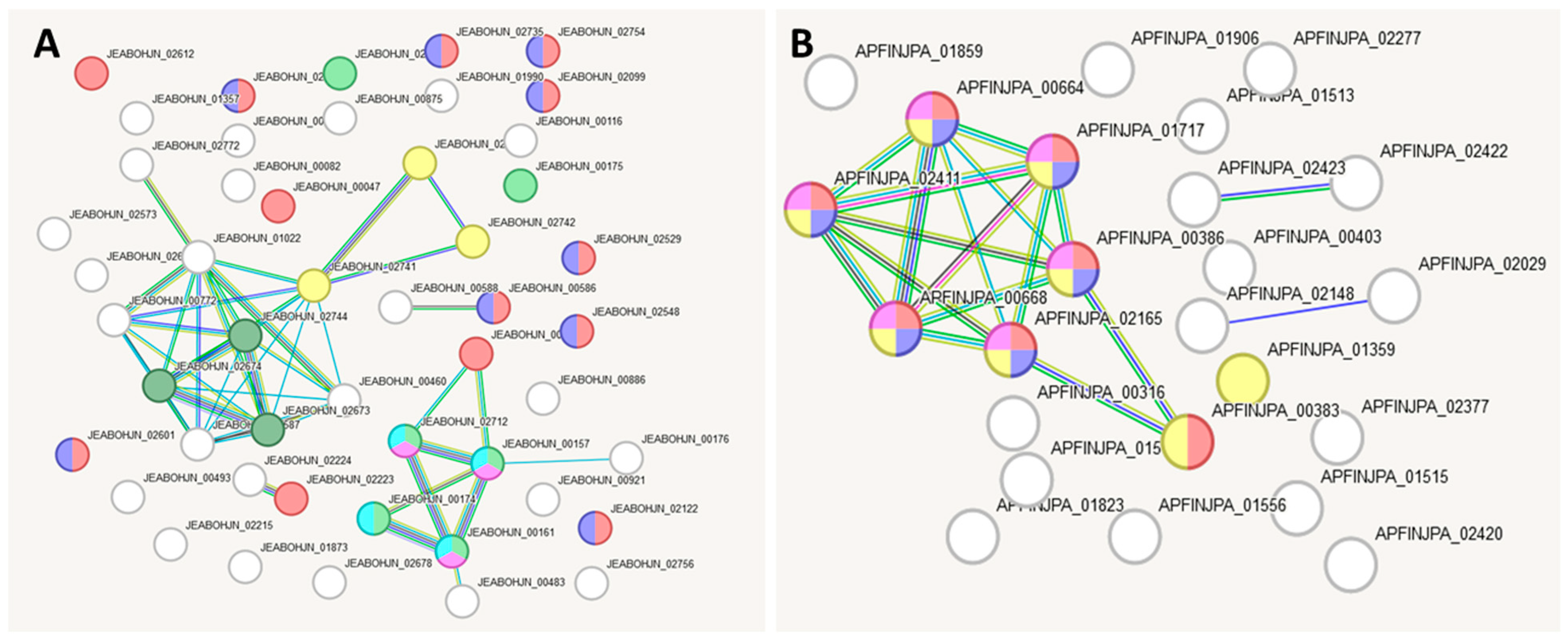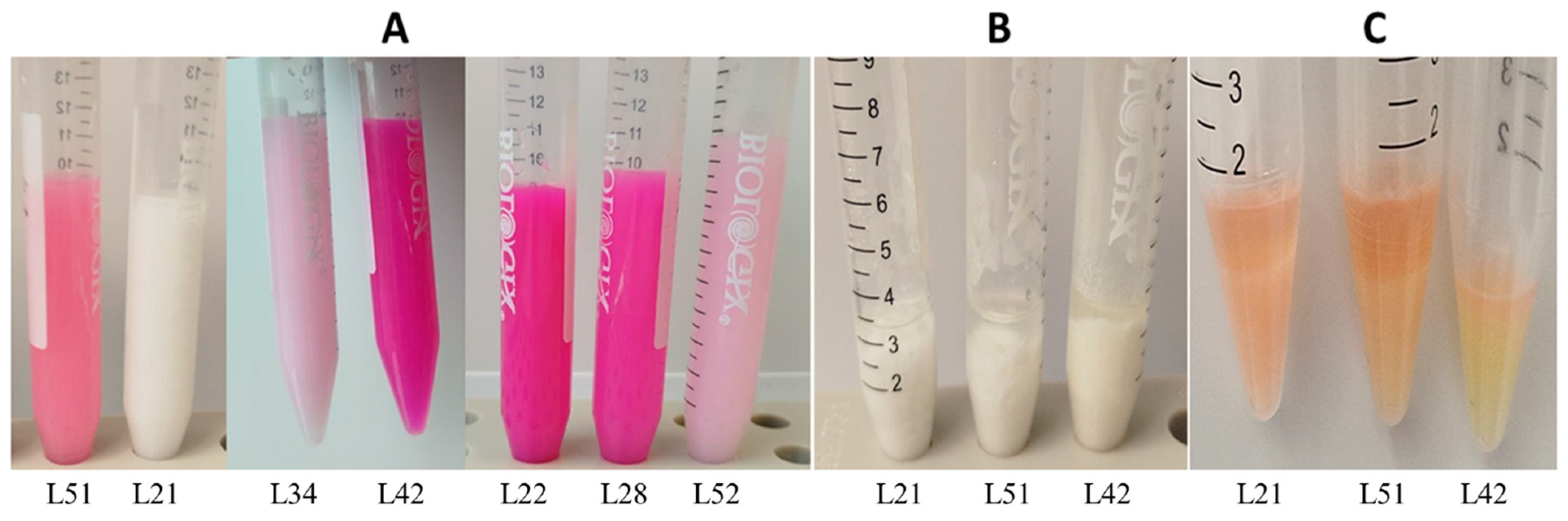 2.7. Bioinformatic Analysis of Gene Interaction Networks in Strains L21, L42 and L51 from the lakt1p Consortium