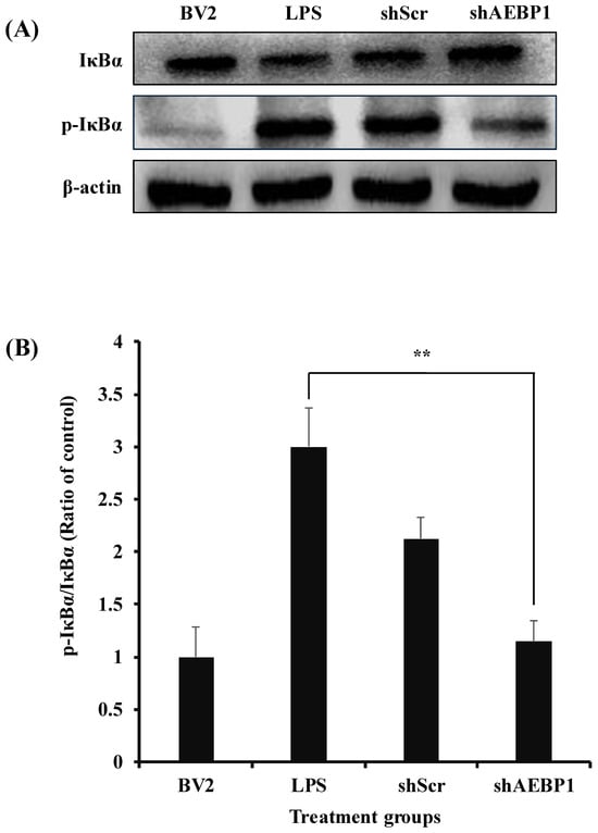 The decreased IκBα phosphorylation by AEBP1 knockdown in BV2 microglial cells. (A) The expression level of p-IκBα in BV2 cells treated with shAEBP1 evaluated by western blotting. (B) Quantitative values of p-IκBα by western blotting. Data are shown as mean ± SD (n = 3). ** p < 0.02 compared with the LPS-treated group.