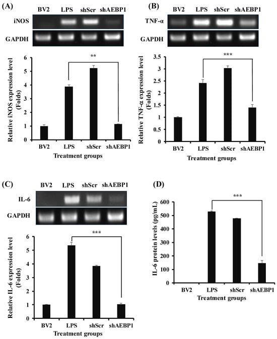 Decreased cytokine expression by AEBP1 knockdown in BV2 microglial cells. Immune cytokine expression and quantified values in AEBP1-downregulated BV2 microglial cells for (A) iNOS, (B) TNF-α, and (C) IL-6. The y-axis “fold” values represent densitometric quantification normalized to the loading control (GAPDH) and then expressed relative to the control BV2 group (set to 1). (D) IL-6 expression levels measured by ELISA. Data are presented as mean ± SD (n = 3). ** p < 0.02, *** p < 0.01 compared with LPS-treated group.
