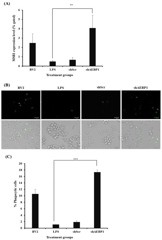 Subsequently, the phagocytic ability of microglia was evaluated using a phagocytosis kit (Figure 6B,C). BV2 cells were treated with FITC-labeled beads to measure phagocytosis in vitro. When the cells responded to the beads, they exhibited fluorescence. The final results were analyzed by merging the bright and fluorescent field images captured using a ZOE fluorescence microscope. In the results, it was observed that the number of cells exhibiting fluorescence was higher in shAEBP1-treated BV2 cells than in LPS- or shScr-treated cells. As shown in Figure 6, downregulation of AEBP1 in activated microglia increased the expression of phagocytic receptors, resulting in enhanced phagocytic ability of microglia.