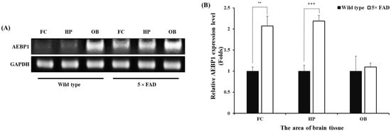 We next evaluated the expression of AEBP1 in the brain environment, where pathological proteins accumulate, to assess its potential as a biomarker or therapeutic target for future clinical applications. We attempted to confirm this using a 5× FAD mouse model of Alzheimer’s disease. Genomic DNA was extracted from the frontal cortex (FC), hippocampal formation (HP), and olfactory bulb (OB) tissues, which are known to have abundant microglia in AD model mice (5× FAD) [35,36] and normal wild-type (WT) mice, and the expression of AEBP1 was examined by PCR.