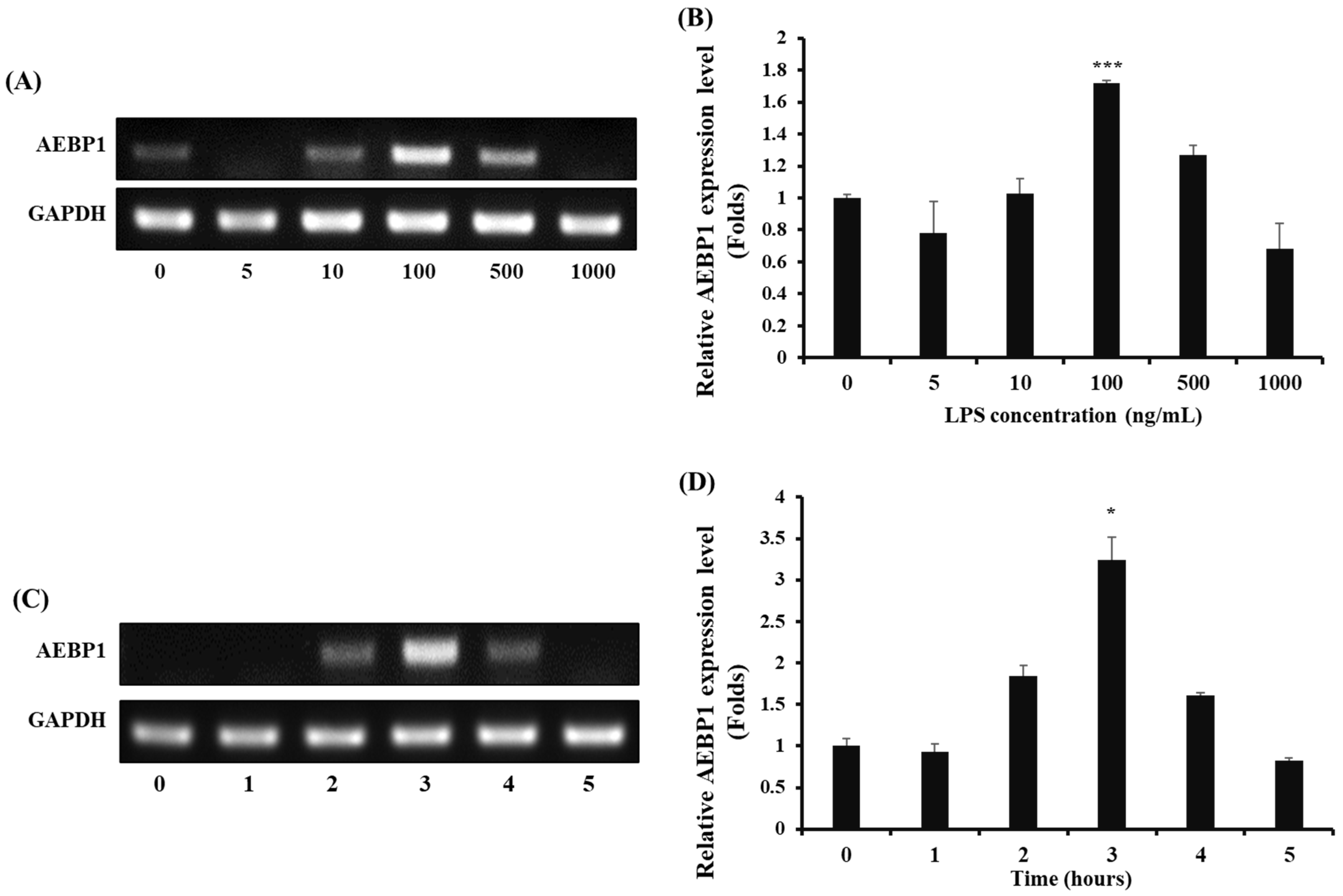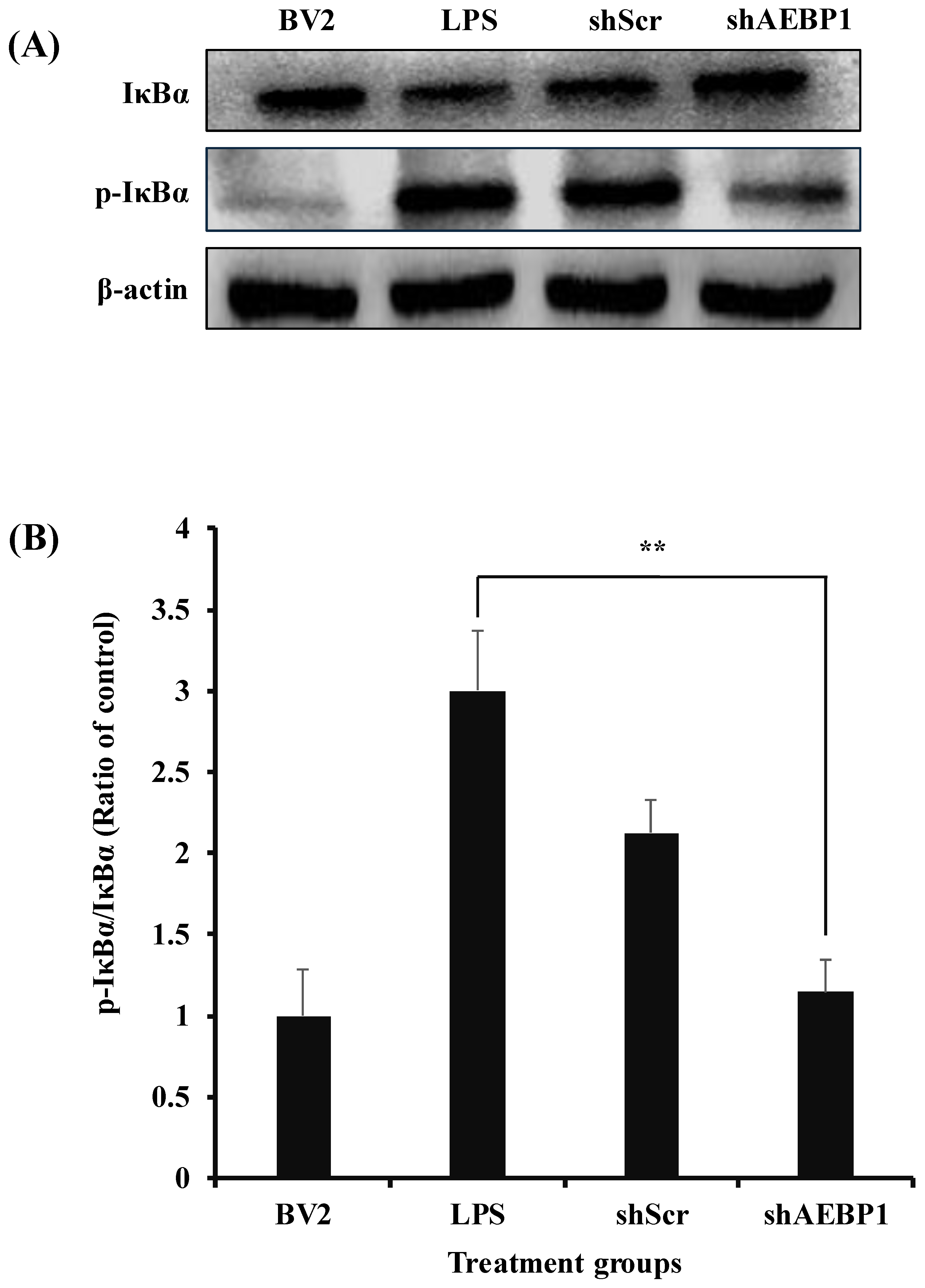 Figure 1) and evaluated the role of this gene in microglial function. A biological process was observed following treatment with shAEBP1, which inhibited the intrinsic function of this gene. At 3 h, AEBP1 showed a non-monotonic response to LPS. This pattern may reflect dose-dependent kinetics of TLR4/NFκB activation and negative feedback (tolerance), where higher LPS levels can shift the response toward an earlier peak and earlier decline. The downregulation of AEBP1 in activated microglia led to reduced phosphorylation of IκBα (