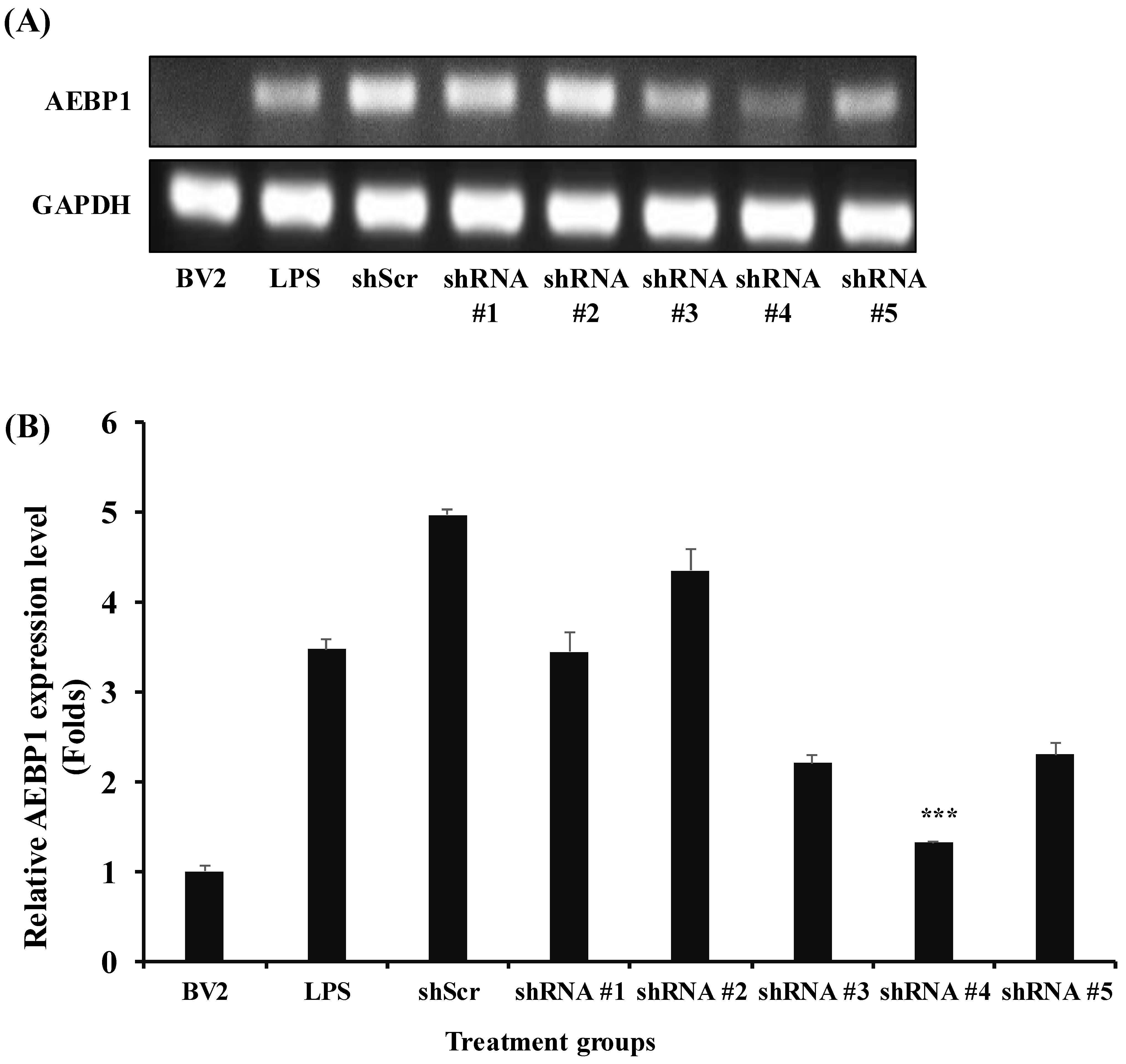BV2 cells were seeded at cells/mL in a six-well plate. Afterwards, shRNA-AEBP1 and shScr were transfected using Lipofectamine 3000 (Invitrogen, Carlsbad, CA, USA) according to the manufacturer’s protocol. Four hours after transfection, the medium was changed to 10% DMEM, and the cells were cultured for 24 h before conducting the experiment.