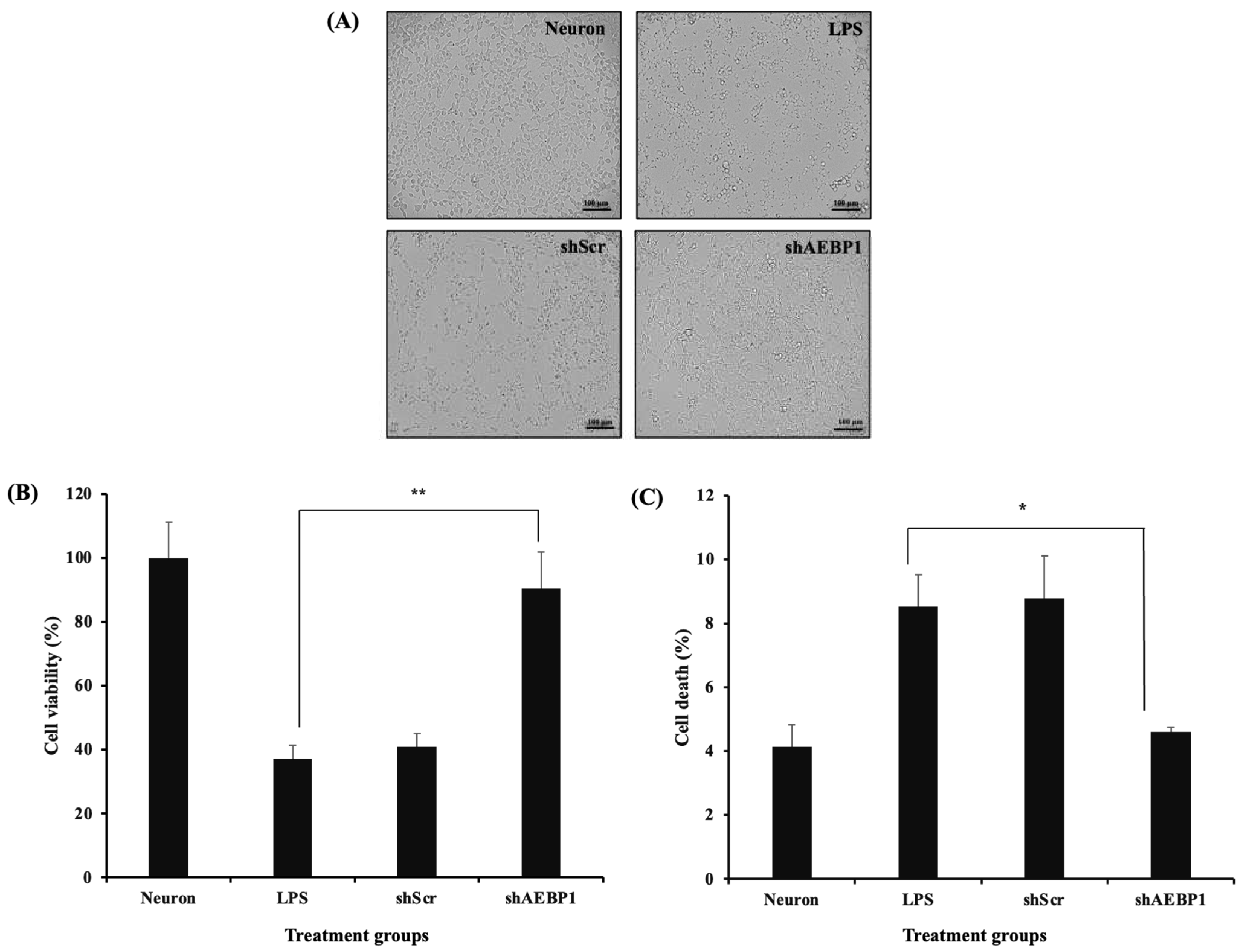Figure 6B,C showed that downregulation of AEBP1 can enhance the phagocytic ability of microglial cells, indicating that the downregulation of AEBP1 induces conversion to M2 microglia. Based on the premise that these results would ultimately affect the survival and death of neurons, we evaluated this effect using a co-culture experiment of microglia and neurons. The results shown in