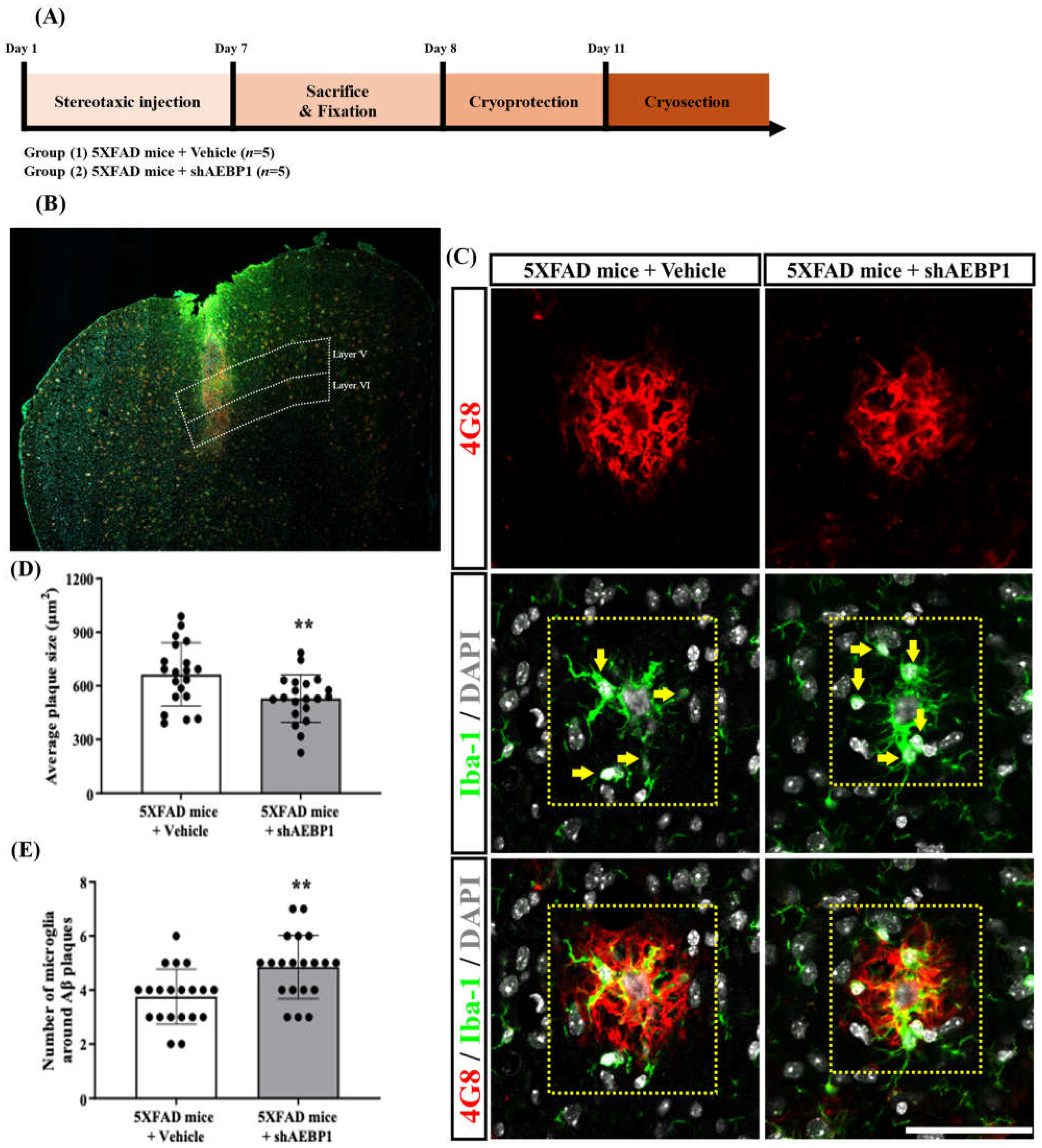 To investigate the effect of shAEBP1 on microglial recruitment in the brains of 5XFAD mice, two to three tissues were collected from the frontal cortex (between +1.42 and +2.22 mm from bregma;