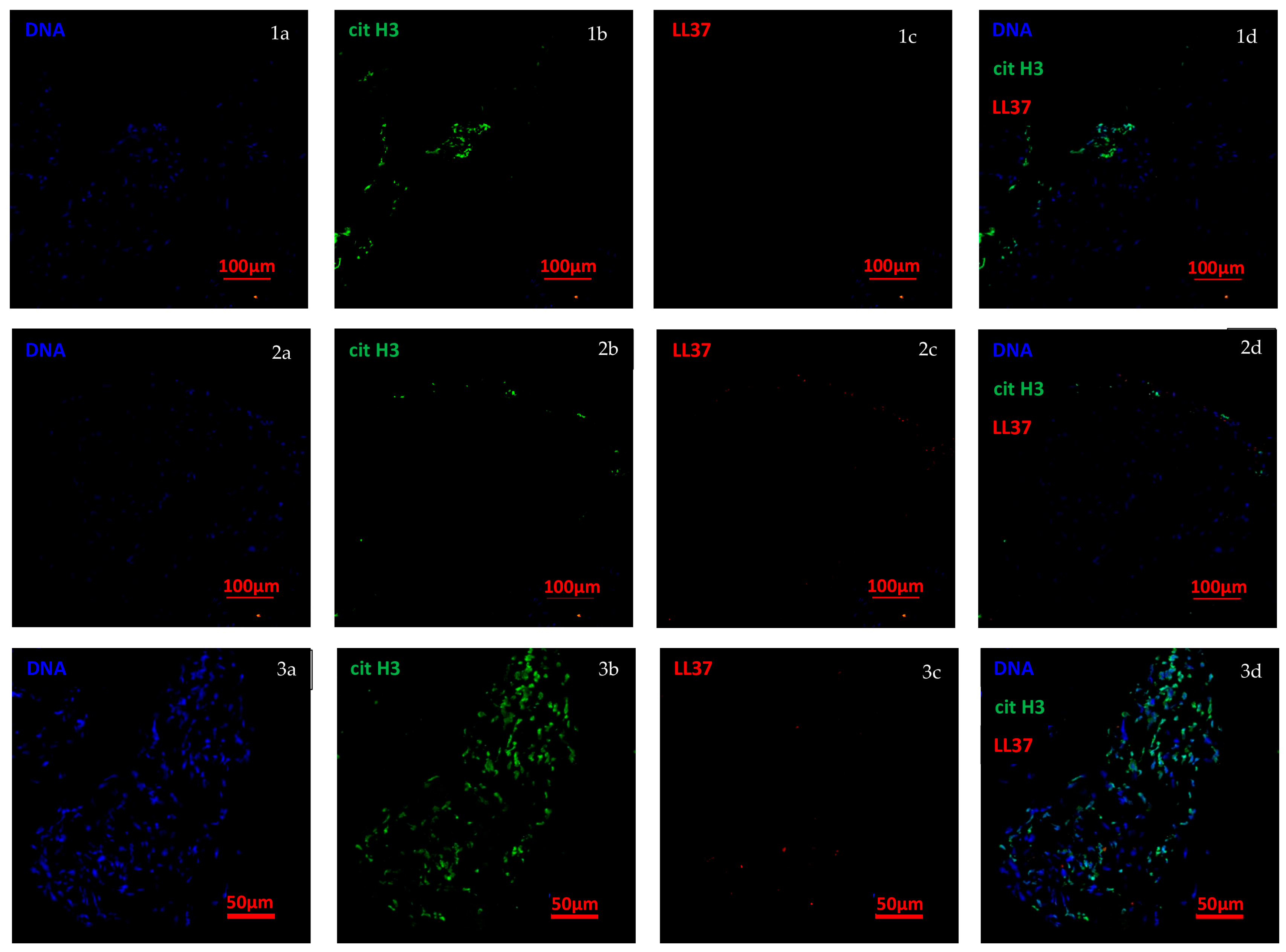 For confocal microscopy, paraffin-embedded muscle-tissue sections were deparaffinized. After epitope retrieval with the IHC-TEK epitope retrieval solution (IHC WORLD Life Science Products & Services, Ellicott City, MD, USA), slides were blocked for one hour with 10% BSA. Then, the slides were incubated overnight at 4 °C with rabbit anti–human citrullinated histone H3 (Abcam, Cambridge, UK; dilution 1:750), and mouse anti–human LL37 (Santa Cruz Biotechnology, Dallas, TX, USA; 1: 100) diluted in 5% BSA. After washing 3 times with PBS, secondary Abs were added (donkey anti–rabbit Alexa Fluor 488, 1:500, donkey anti–mouse Alexa Fluor 594 [1:500 in 5% BSA], all from Thermo Fisher Scientific, Waltham, MA, USA). Then, the slides were incubated for 10 min at room temperature with 1:1000 Hoechst 33,342 (Thermo Fisher Scientific) and mounted with ProLong Gold Antifade (Thermo Fisher Scientific). The samples were acquired in an Eclipse Ti-E Nikon confocal microscope (Nikon, Minato, Tokyo, Japan).