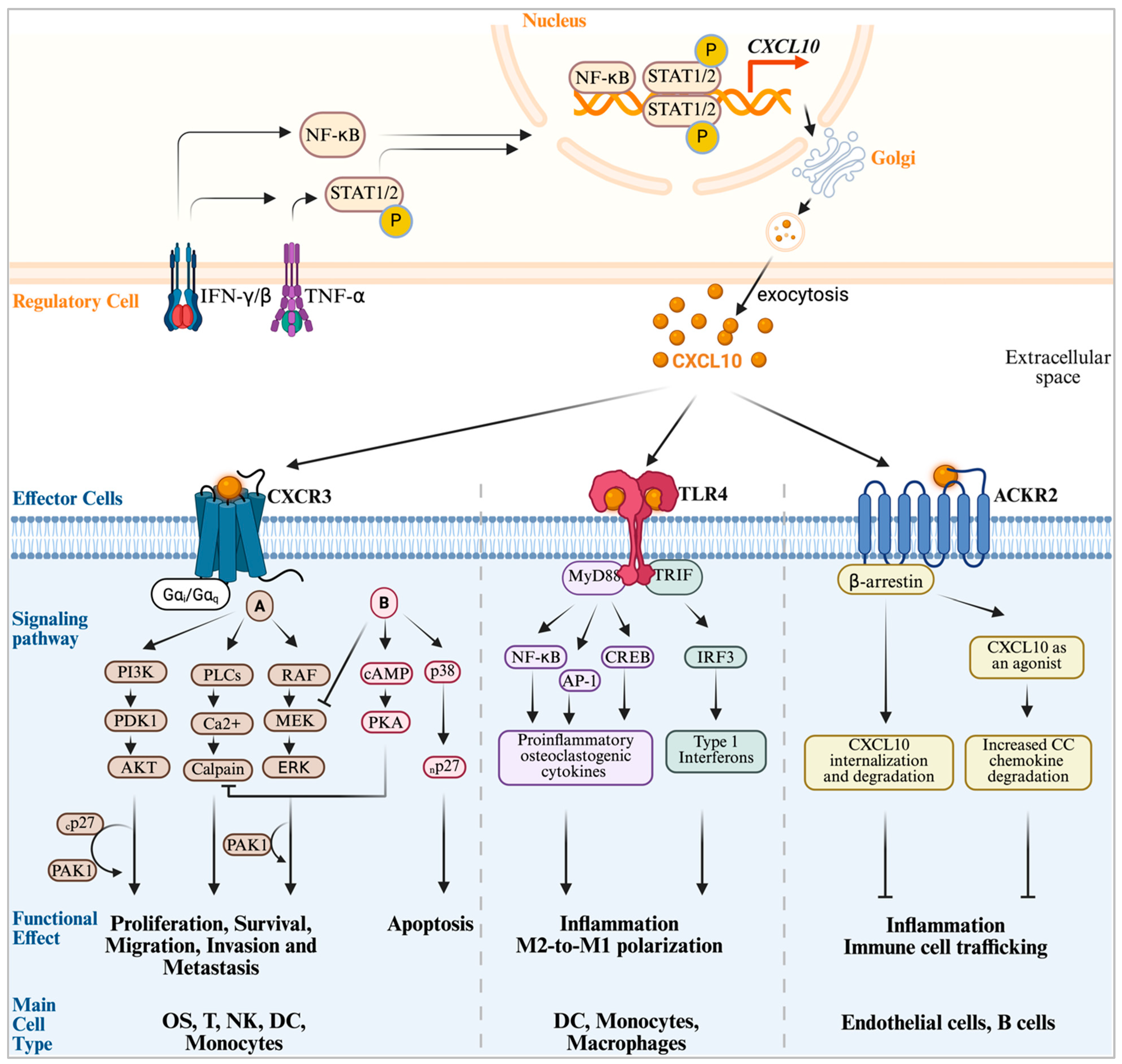Figure 1. Canonical and non-canonical signaling networks of CXCL10. CXCL10 production in regulatory cells—including monocytes, fibroblasts, and OS cells—within the TME is primarily induced by pro-inflammatory cytokines such as IFN-γ, IFN-β, and TNF-α. These stimuli activate intracellular signaling cascades that culminate in the phosphorylation and nuclear translocation of the transcription factors NF-κB and STAT1/2, driving CXCL10 gene transcription. The translated CXCL10 protein is processed through the Golgi apparatus and secreted into the extracellular milieu via exocytosis. Secreted CXCL10 interacts with multiple receptors on adjacent effector cells, initiating diverse signaling pathways and downstream functional responses. CXCL10–CXCR3 canonical signaling: CXCL10 binds to its cognate G protein–coupled receptor CXCR3, which is expressed on OS cells, T cells, NK cells, and monocytes. Ligand engagement of CXCR3-A activates pro-survival and metastatic pathways, notably the PI3K–PDK1–AKT axis. In contrast, CXCR3-B engagement promotes apoptosis and suppresses survival signaling through the p38 MAPK and cAMP-dependent pathways. CXCL10 non-canonical signaling: CXCL10 also signals through non-canonical receptors, particularly TLR4 and ACKR2, which elicit opposing effects on inflammation. CXCL10–TLR4 interaction engages MyD88-dependent pathways leading to NF-κB-, AP-1-, and CREB-mediated transcription of pro-inflammatory cytokines, while IRF3 activation induces type I interferon production. Conversely, ACKR2 functions as a scavenger receptor: β-arrestin–mediated binding of CXCL10 to ACKR2 promotes its internalization and lysosomal degradation. This clearance mechanism is essential for shaping chemokine gradients, thereby attenuating inflammation and restricting immune cell trafficking within the TME. Standard arrow conventions apply. Created in Biorender. Benjamin B Gyau. (2025) https://app.biorender.com/illustrations/68c44a55e0acb9484c289e06.