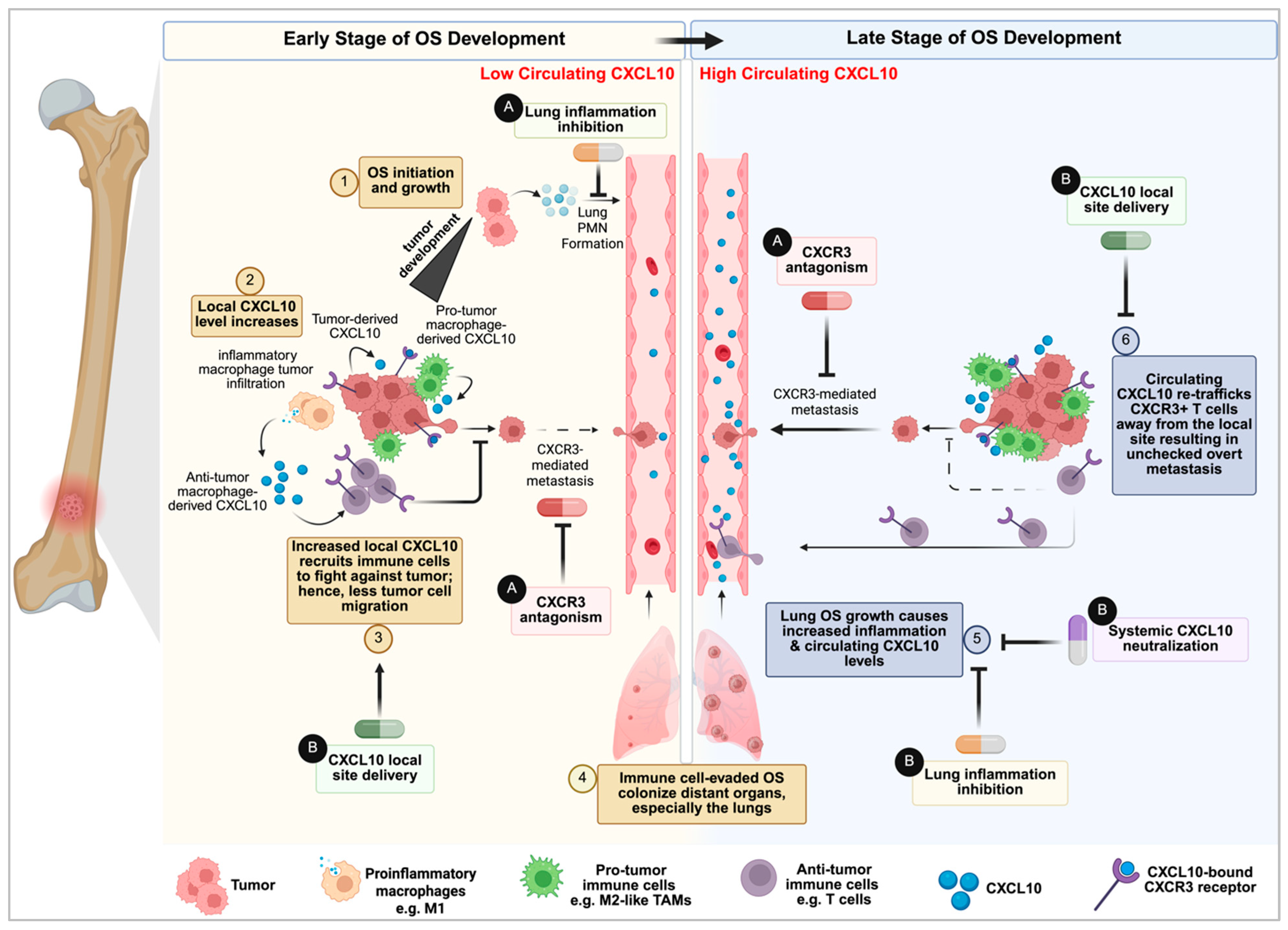 Our proposed model and a better understanding of the role of CXCL10 in OS pathogenesis opens several promising avenues for therapeutic development. For patients identified early (e.g., with low to medium circulating CXCL10 and no overt metastases), a logical strategy is to disrupt the entire pro-tumor cycle. Systemic administration of a CXCR3 antagonist, such as AMG487, could confer dual benefits by inhibiting the direct pro-migratory effects on OS cells and simultaneously preventing CXCL10-mediated conditioning of lung macrophages, thereby blocking PMN formation and the subsequent establishment of the systemic immune decoy. Preclinical evidence supporting this approach is robust (Figure 3-A), suggesting that early intervention targeting the CXCL10–CXCR3 axis may effectively mitigate both primary tumor progression and the facilitation of metastatic dissemination [71,118,120,171].