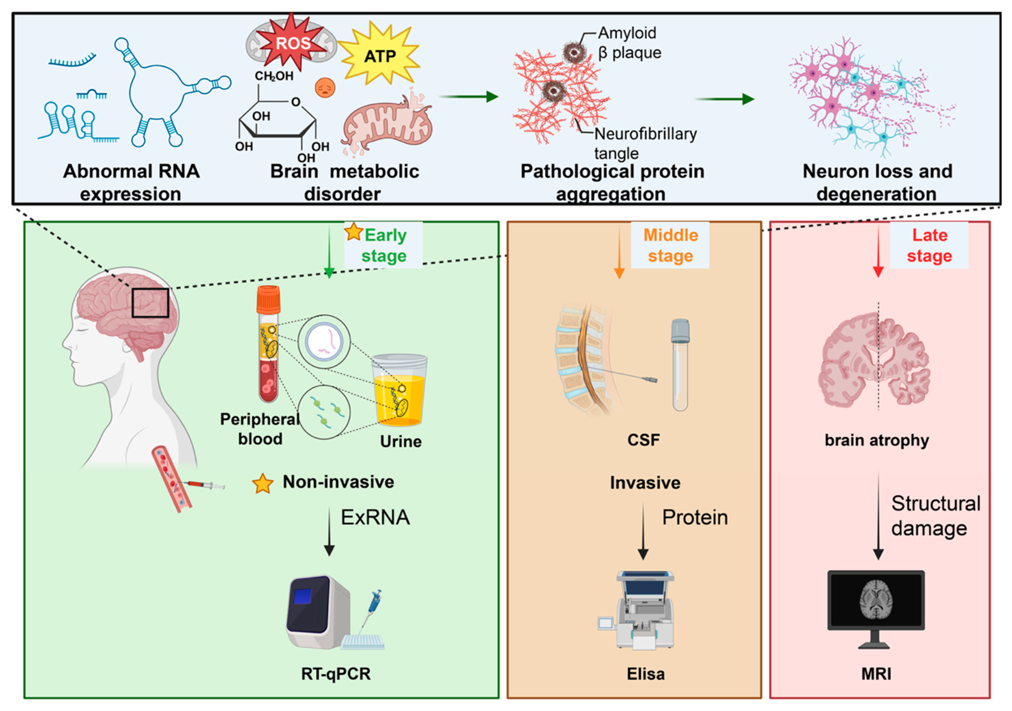 | Alzheimer’s disease (AD) | FDG-PET hypometabolism, MRI-detected cortical atrophy | Aβ42 ↓/Tau ↑ | Mostly diagnosed at middle to late stages | Cannot reflect early transcriptional or metabolic alterations | [43,161] |