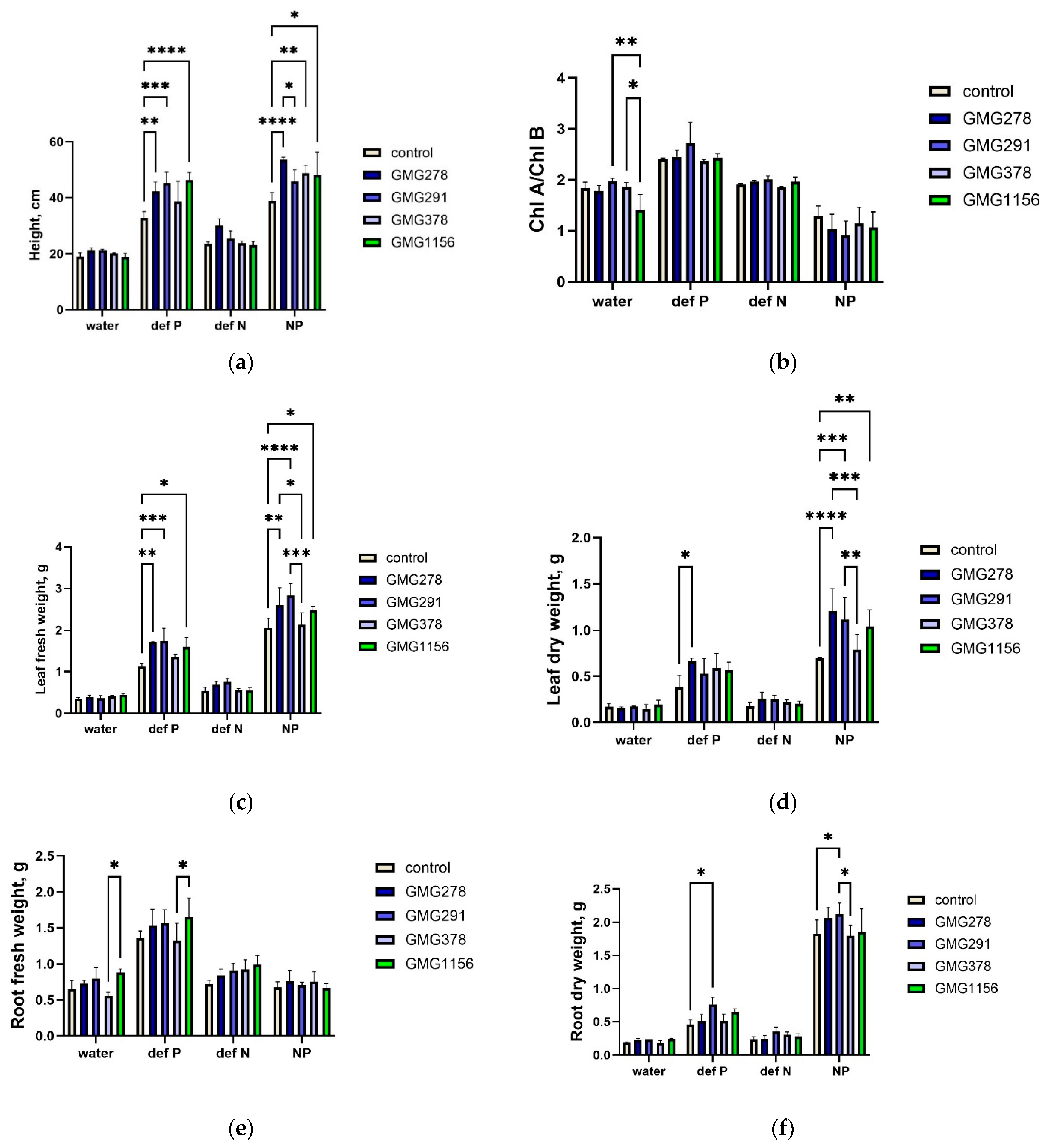 The control pots were irrigated with water. In the case of adding mineral fertilizer, including nitrogen and phosphorus, watering was done using a solution in mg/L containing the following: N-103, P-37, K-111, Ca-113, Mg-27, and S-35, with the addition of chelated elements such as Fe—3.87, Mn—2.6, Zn—0.53, Cu—0.53, Mo—0.13 and B—0.5. Conditions of nitrogen or phosphorus deficiency were created by excluding the corresponding components from the mineral mixture used for irrigation. Watering was done as soon as the soil became dry. The experiment was set up as a randomized trial with three biological replicates.