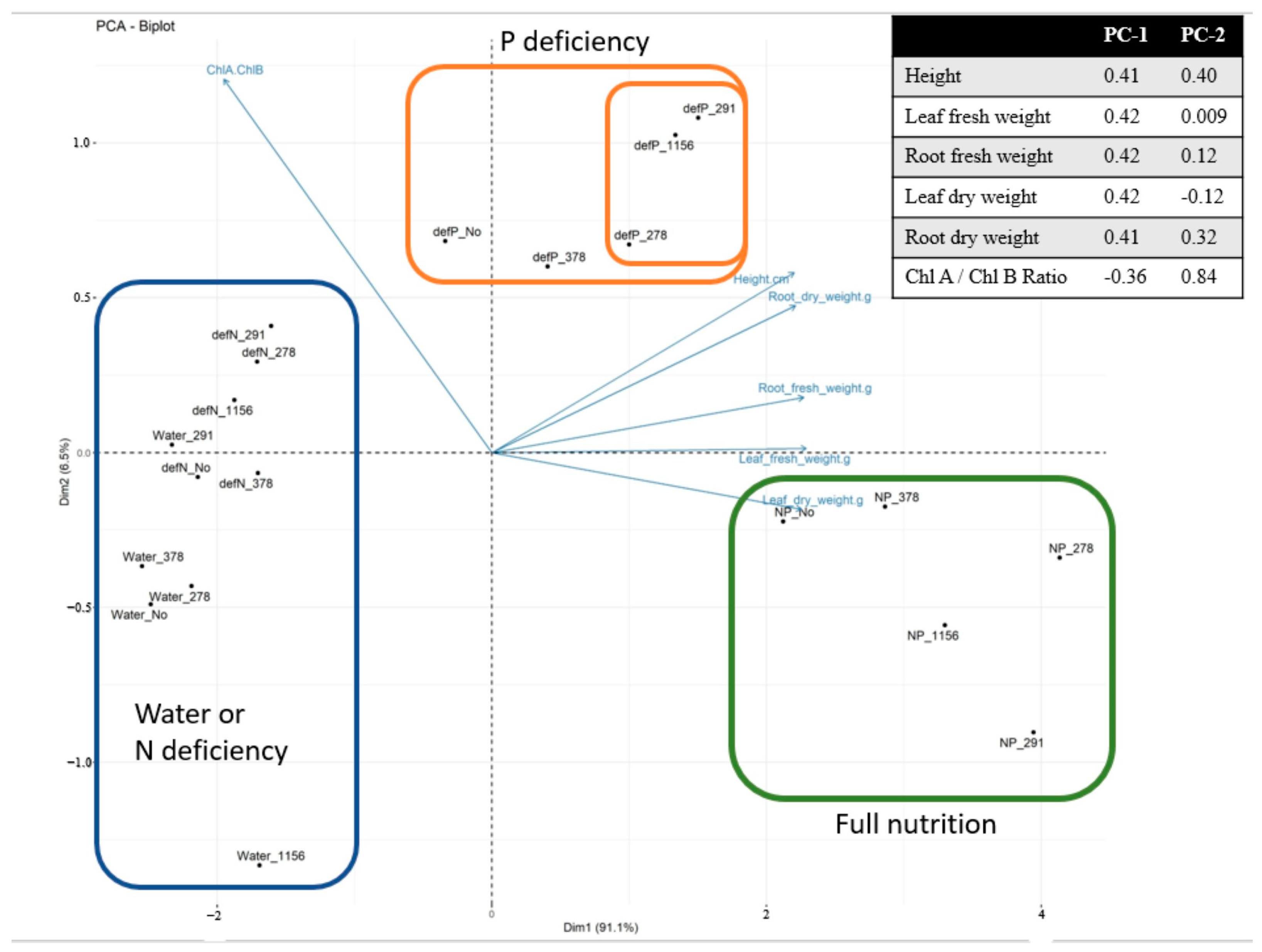 The PCA has clearly visualized this separation, with the samples forming three distinct clusters: complete nutrient deficiency, phosphorus-deficient with bacterial inoculation, and complete nutrition. Strains GMG278, GMG291, and GMG1156 are located closer to the complete nutrition cluster, along principal component 1 (PC1), which explains 91.1% of the variation. It is important to note that our chosen experimental model, with a limited supply of phosphorus in the peat substrate and a predominance of insoluble phosphate forms, is as close as possible to real-world soil conditions. This is crucial, as one of the major challenges in the research on phosphate-solubilizing microorganisms is the low reproducibility of laboratory findings in field trials [