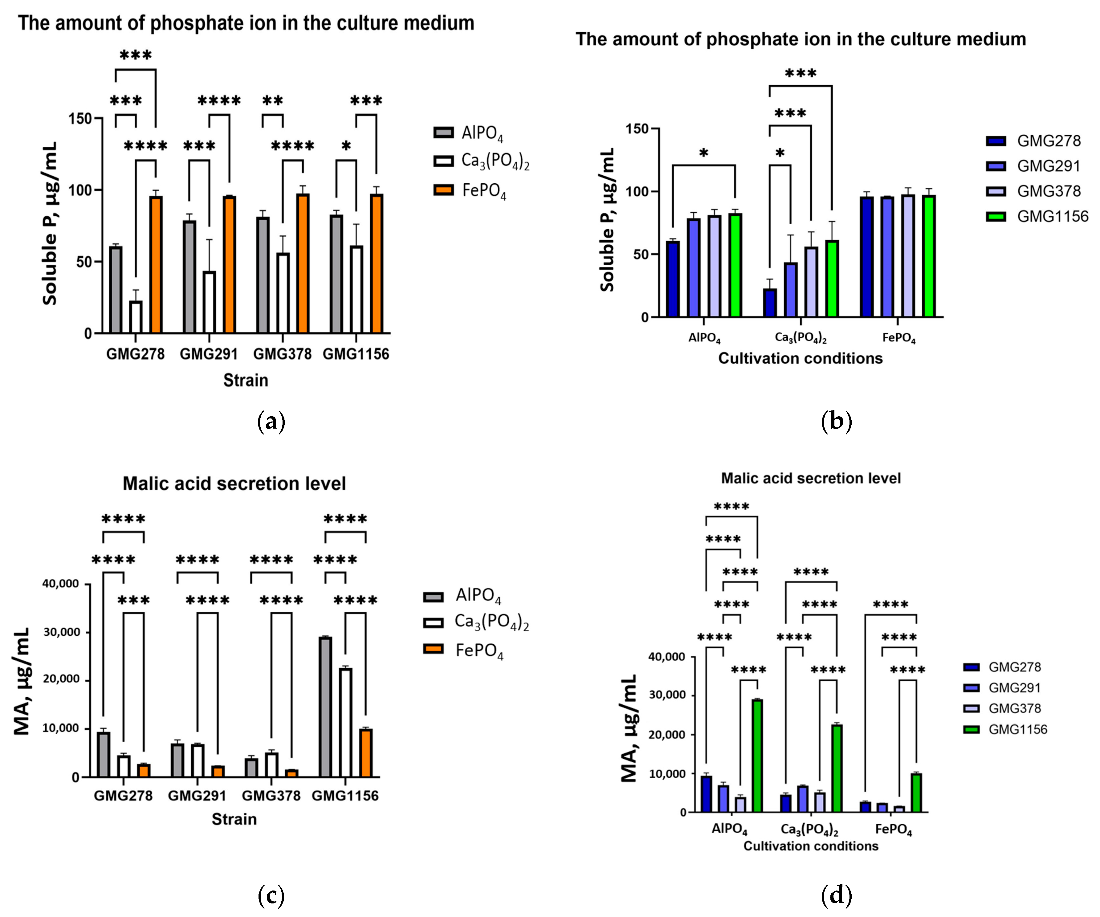 The processes of reprecipitation and adsorption of released phosphorus. Despite the initial solubilization of insoluble phosphorus compounds, the formation of secondary phosphate minerals (strengite, variscite) or phosphorus adsorption on secondary iron(III) hydroxide (Fe(OH)3) and aluminum(III) hydroxide (Al(OH)3) surfaces formed during the complexation of metals with organic acids may reduce measured phosphate concentrations. Measurements were carried out at a single time point (264 h), and it is possible that strains with higher levels of malic acid may reach peak concentrations of soluble phosphorus earlier, followed by a phase of precipitation or biological uptake.