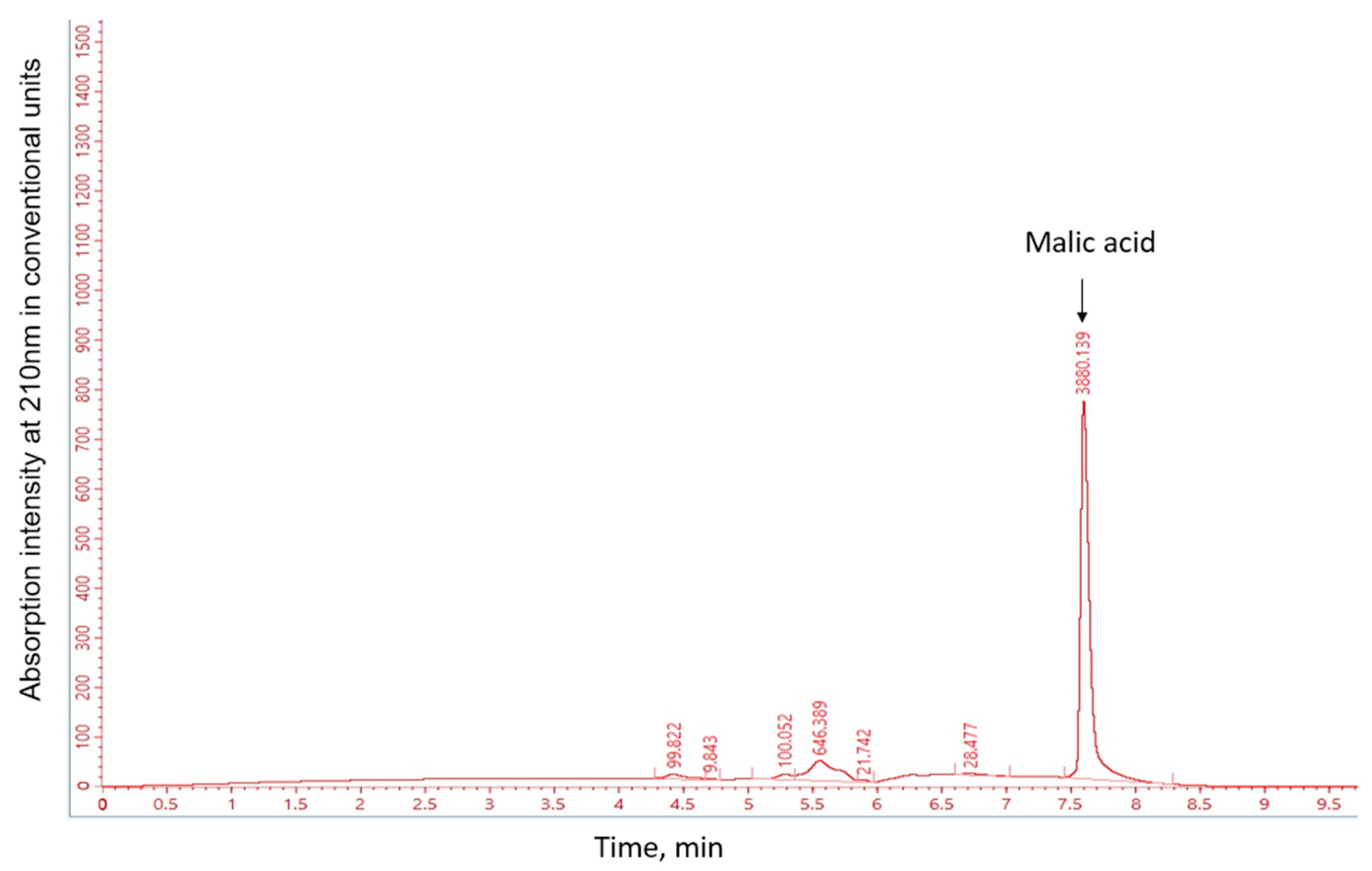 The exclusive detection of malic acid in the strains under study may be attributed to the sampling time, as various organic acids tend to accumulate at different stages of bacterial growth [
