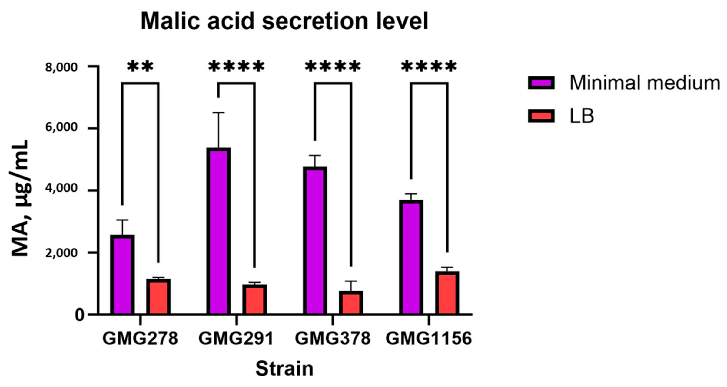 The level of malic acid secretion was significantly dependent on the cultivation conditions. All strains showed an increase in the amount of malic acid secreted in minimal medium, ranging from 2- to 5-fold higher compared to a rich LB medium (see