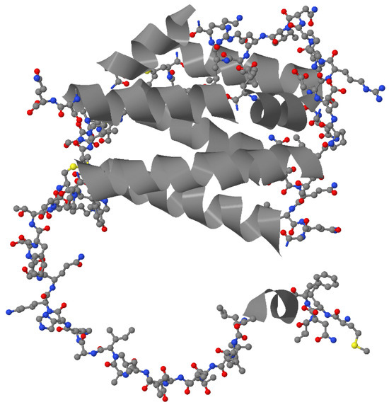 A model of the molecular structure of IL-26 [UniProtKB entry Q9NPH9]. α-helices are depicted as grey ribbons, while all other regions within the molecule are presented as a ball-and-stick model (carbon, nitrogen, oxygen, and sulfur atoms are depicted as grey, blue, red, and yellow balls respectively).