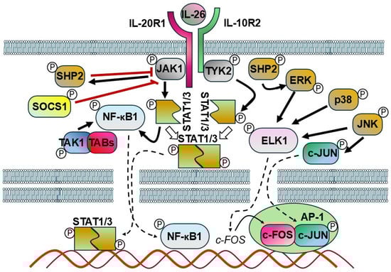 Schematic model representing the potential mechanism of IL-26 signaling. The interaction between IL-26 and its receptor recruits and activates Janus kinases (JAKs). These activated JAKs, in turn, phosphorylate STAT proteins, which are then translocated as dimers into the nucleus where they regulate the expression of various genes. In response to IL–receptor interactions, SHP2 is phosphorylated by JAKs and serves as an early feedback inhibitor. In addition, SHP2 plays a central role in the activation of ERK downstream of various growth factor receptors. Another inhibitory factor, SOCS1, directly suppresses JAK1, JAK2, and TYK2 activity. TAK1 triggers the activation of the sub IKK complex, which subsequently results in the degradation of IκBα. The released NF-kB is activated and translocated into the nucleus where it modulates gene transcription. JNK mitogen-activated protein kinase (MAPK) directly phosphorylates and activates c-Jun. JNK, p38, and ERK phosphorylate and activate ELK-1, which promotes the upregulation of c-Fos. C-Jun and c-Fos form a dimer termed the AP1 complex, which regulates the expression of multiple target genes (bold black arrows: activation, white arrows: dimerization, bold red lines: suppression/inhibition, dashed arrows: transfer to the nucleus, thin black arrow: gene expression).