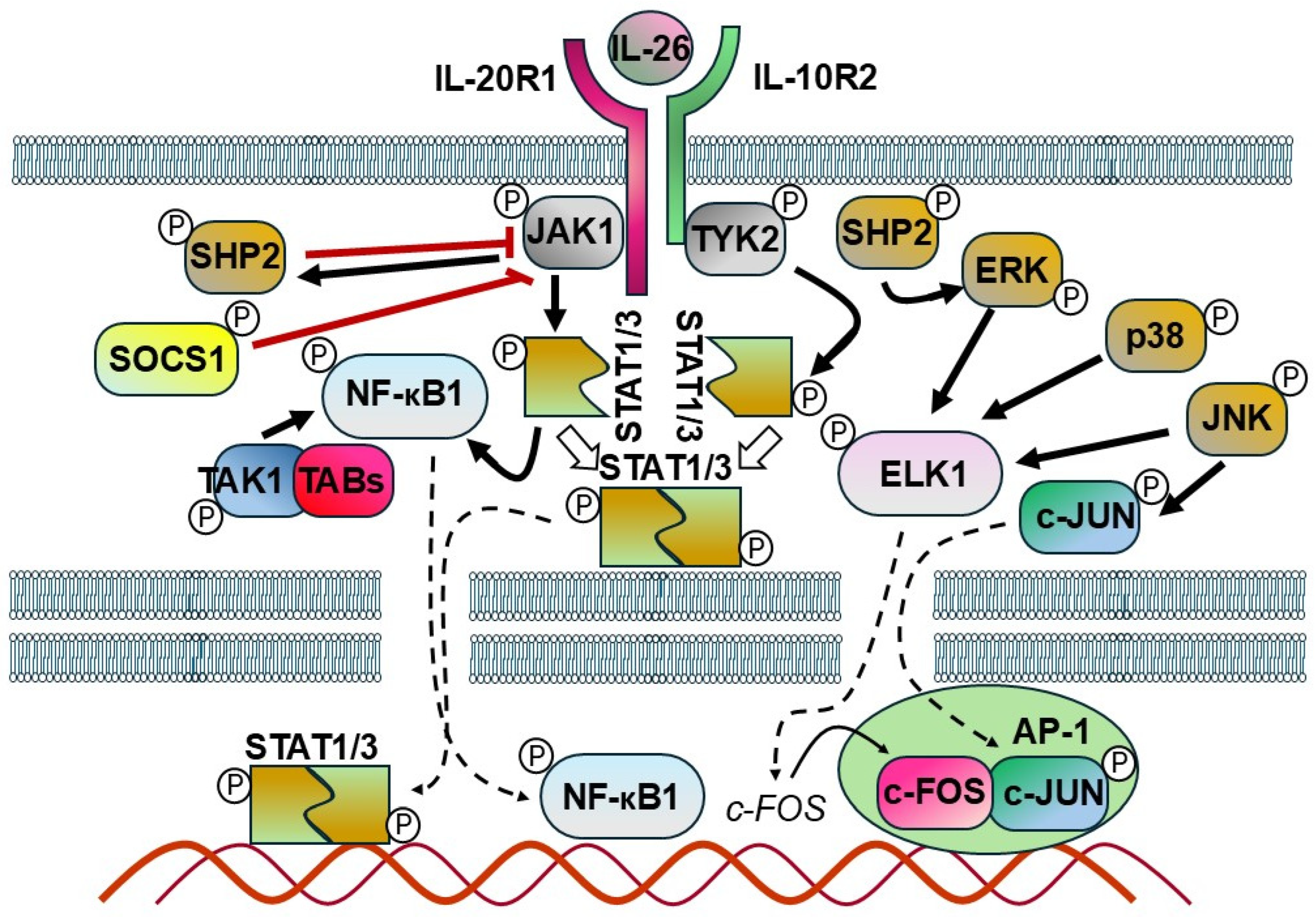 | IL-26 | IL-20R1/IL-10R2 | [6,7] |