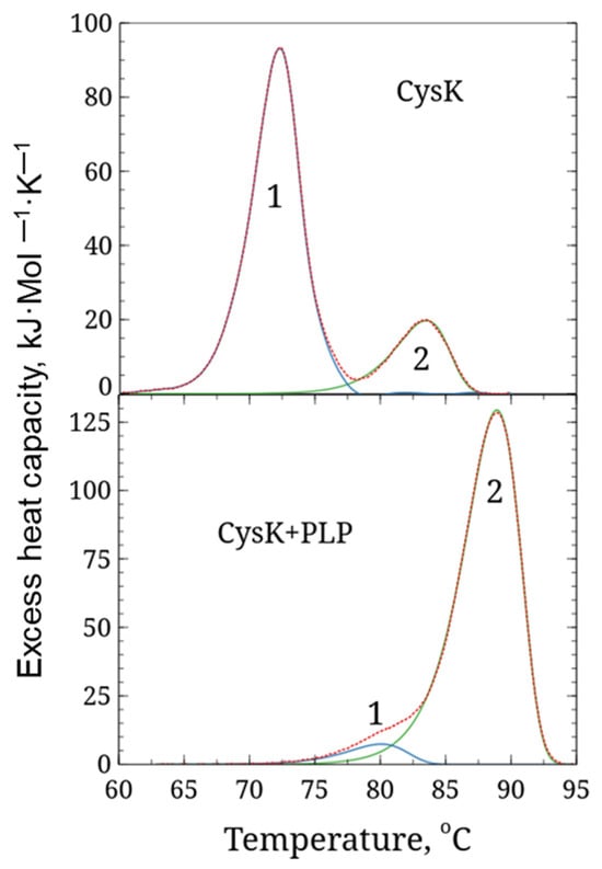 DSC curves for LreCysK apo and holo forms. 1, 2—separate domains. CysK (upper graph)—enzyme incubating without additional PLP, CysK + PLP (lower graph)—enzyme incubating with additional PLP. Red dotted lines—before deconvolution, and solid line—after deconvolution of domains (blue and green line correspond to the first and second domain respectively).