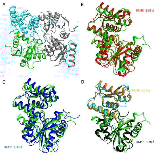 (A) The LreCysKapo functional dimer. The large domain in one subunit is shown in green, the small domain—cyan, and the adjacent subunit—gray. Superposition of the subunits of LreCysKapo (green) with MulCysKapo (red, (B)) and GkaCysKapo (blue, (C)). (D) Superposition of large and small domains of LreCysKapo (green and cyan for LreCysK large and small domains respectively) and MulCysKapo (black and orange for MulCysK large and small domains, respectively). Panels (B)–(D) are presented in the same orientation.