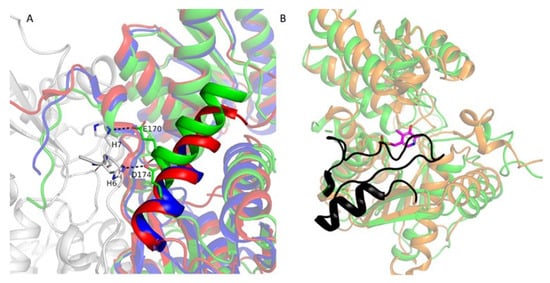 Moreover, α-helix (residues 162–172) (Figure 4) in LreCysKapo has a different conformation than in MulCysKapo (residues 152–166) and GkaCysKapo (residues 157–166) (Figure 4). In LreCysKapo, residues of this α-helix (E170 and D174) form polar contacts with N-terminus His–tag residues (H6 and H7) from the adjacent subunit (Figure 4A). The addition of His–tag to the N-terminus of the enzyme could change the conformation of this α-helix. We assume that these changes don’t influence the catalytic activity since this α-helix is not part of the active site and presumably only stabilizes the conformation. Residues 214–240 and 213–235 in subunits A and B, respectively, have no electron density. Moreover, this region is absent in MulCysKapo (residues 183–204) and GkaCysKapo (residues 207–229). This region has no electron density in all apo form structures due to the high mobility. In StyCysK holo form structure (PDB ID 6Z4N, StyCysKholo), this region (residues 206–240, black in Figure 4B) is clearly visible and shields the active site from the solvent and fixes the PLP in the active site.