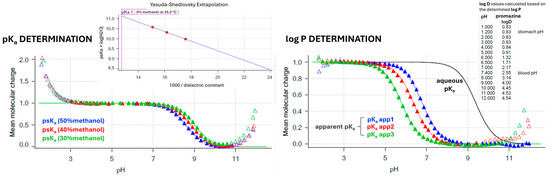 Using the Sirius T3 device, the physicochemical properties of the reference drugs were determined by automated potentiometric titrations. The compounds’ acidity was measured by determining their pKa parameters. Three independent measurements of pKa values in ionic strength adjusted (ISA) water (0.15 M KCl) were conducted subsequently in one vial. For poorly soluble compounds the cosolvent (methanol) was applied, with three independent measurements of the apparent pKa (psKa) conducted with the diverse weight % content of the methanol in assay conditions (water/cosolvent ratios of 70/30, 60/40, and 50/50, respectively). The obtained psKa values were next extrapolated to the 0% content of methanol (pure ISA water) using the Yasuda–Shedlovsky extrapolation plots. The lipophilicity of the research compounds (log P parameters) was measured by the automated potentiometric method as well, based on the previously obtained compounds’ pKa values. The aqueous pH-metric titrations were carried out in the presence of n-octanol—an immiscible water partition solvent. Under these circumstances, a lipophilic sample partitions into the octanol layer and causes a shift to the aqueous phase equilibria, resulting in the appearance of the apparent pKa (poKa) (Figure 5). The log P parameters were determined based on the differences between the apparent poKa and aqueous pKa values in three independent titrations conducted with diverse volume ratios of the aqueous and n-octanol phases. Log D7.4 values were calculated automatically by the Sirius T3 Refine software (version 2.0.0.0) based on the obtained log P and pKa values.