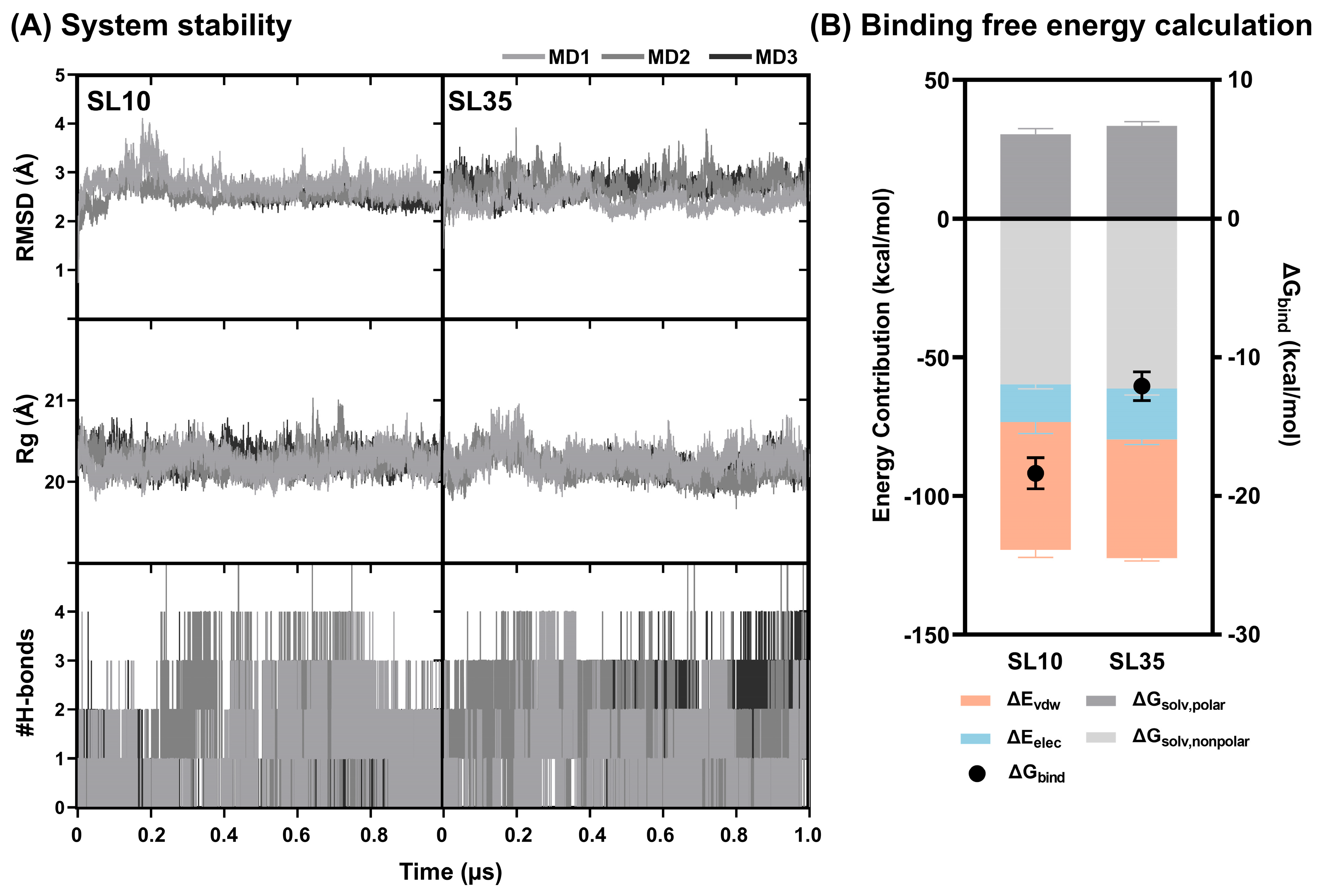 - Miller, B.R., III; McGee, T.D., Jr.; Swails, J.M.; Homeyer, N.; Gohlke, H.; Roitberg, A.E. MMPBSA. py: An efficient program for end-state free energy calculations. J. Chem. Theory Comput. 2012, 8, 3314–3321. [Google Scholar] [CrossRef] [PubMed]
