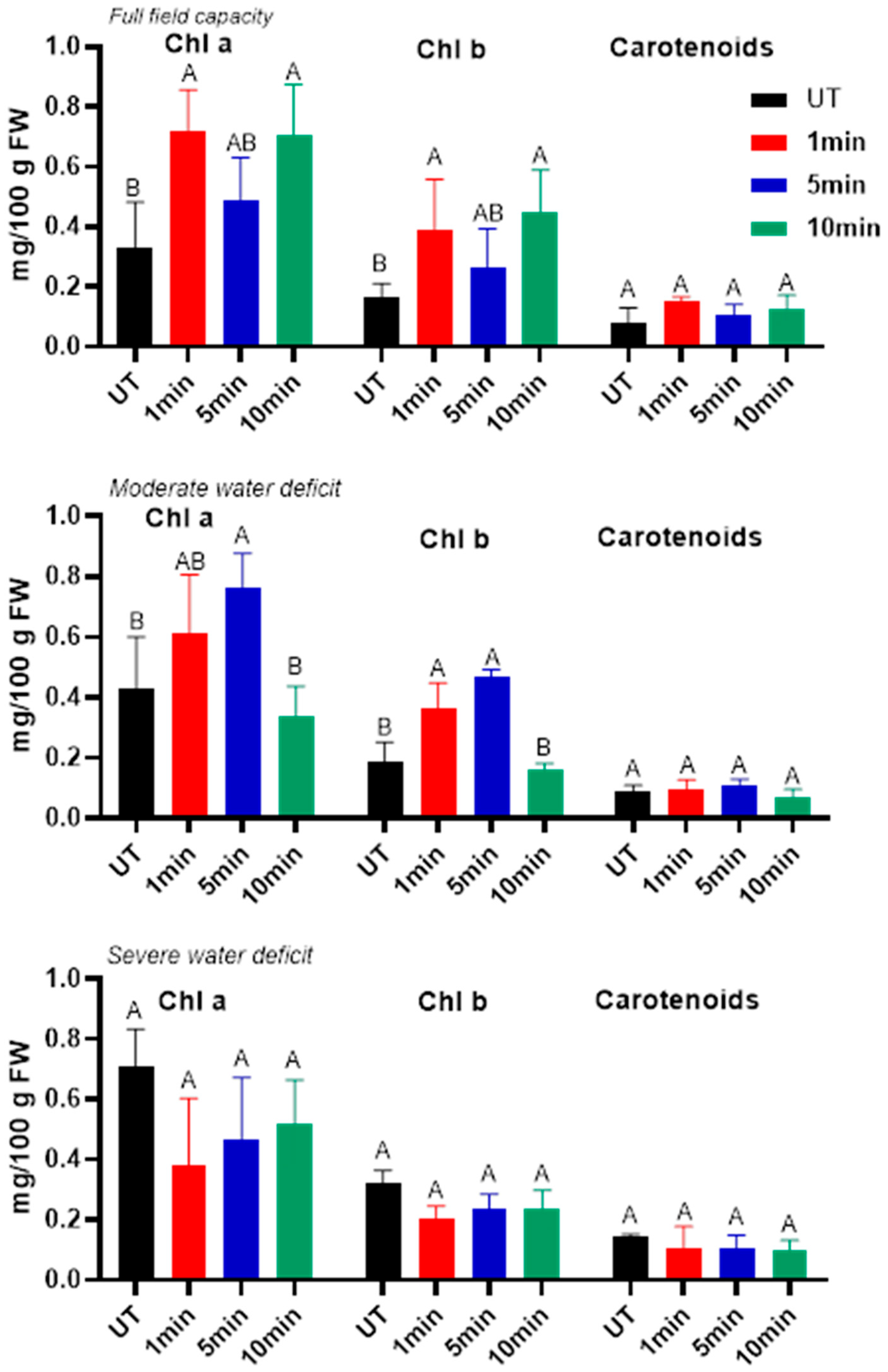 | Full field capacity (100% FC) | UT | 77.0 ± 7.5 a | 16.8 ± 2.9 a | 31.8 ± 11.3 b | 27.4 ± 1.9 c |