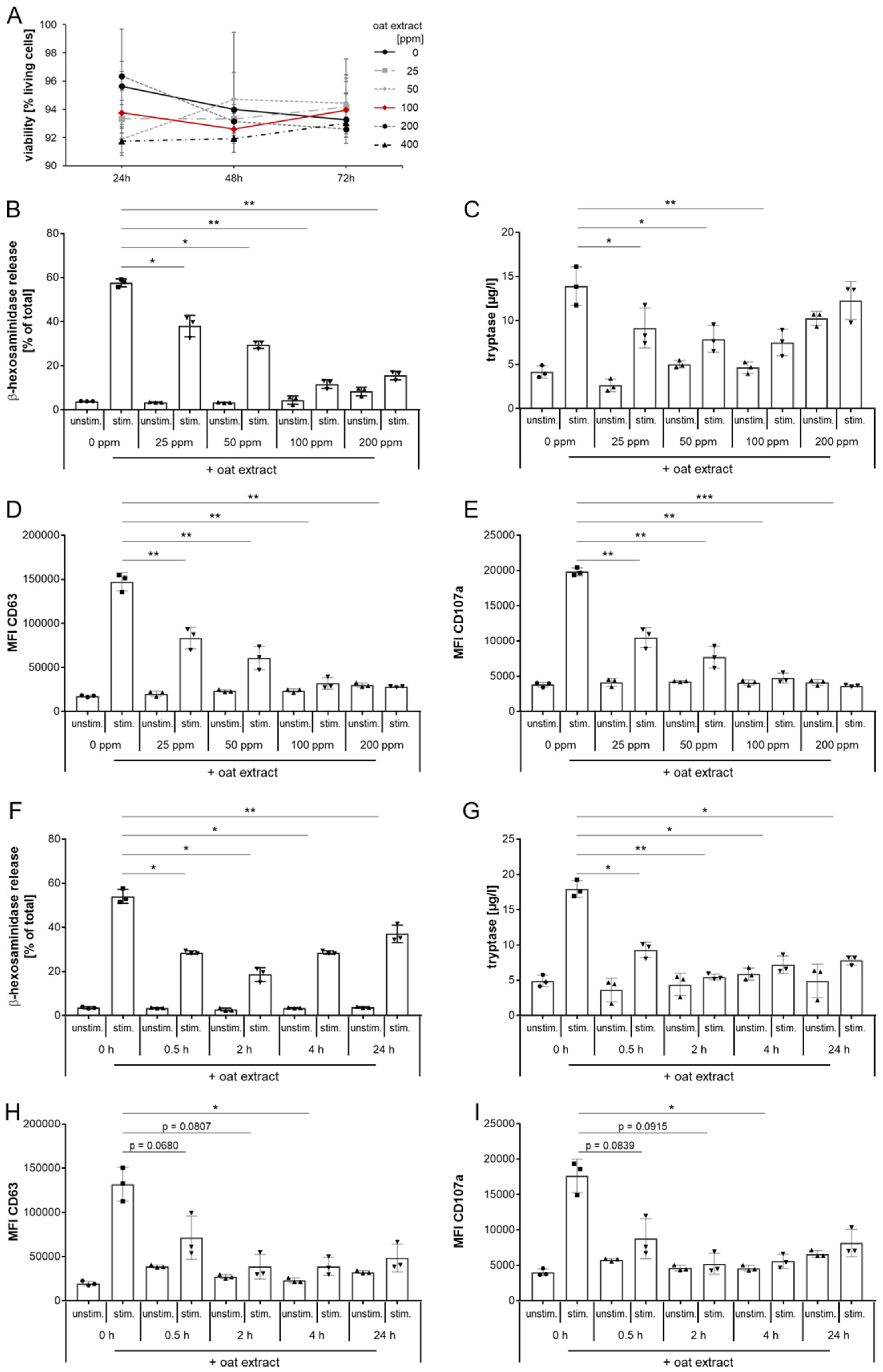 2.3. Evaluation of Oat Extract as a New Inhibitor of MRGPRX2 Activation with LAD2 Cells