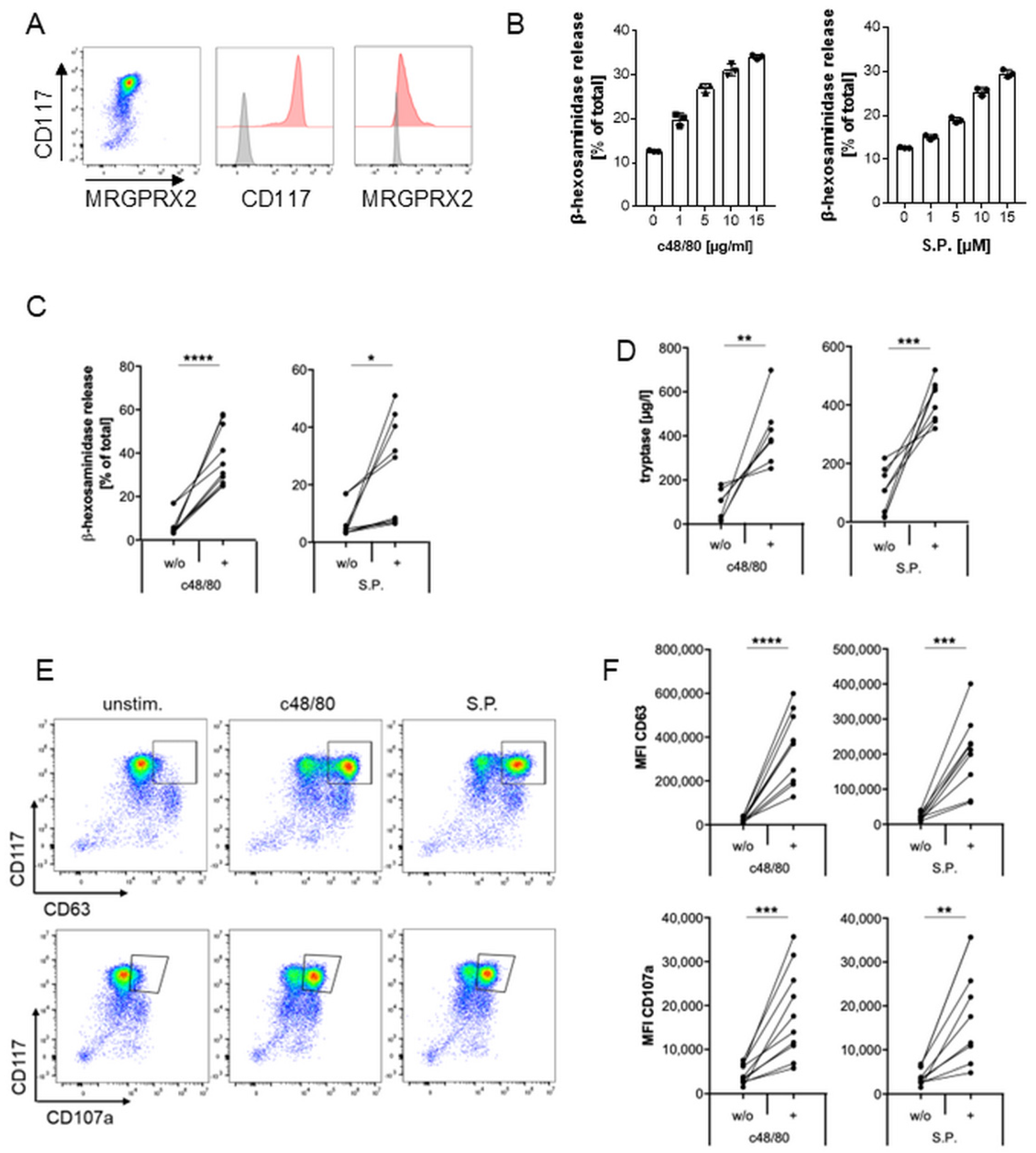 - Ieven, T.; Goossens, J.; Roosens, W.; Jonckheere, A.C.; Cremer, J.; Dilissen, E.; Persoons, R.; Dupont, L.; Schrijvers, R.; Vandenberghe, P.; et al. Functional MRGPRX2 expression on peripheral blood-derived human mast cells increases at low seeding density and is suppressed by interleukin-9 and fetal bovine serum. Front. Immunol. 2024, 15, 1506034. [Google Scholar] [CrossRef]