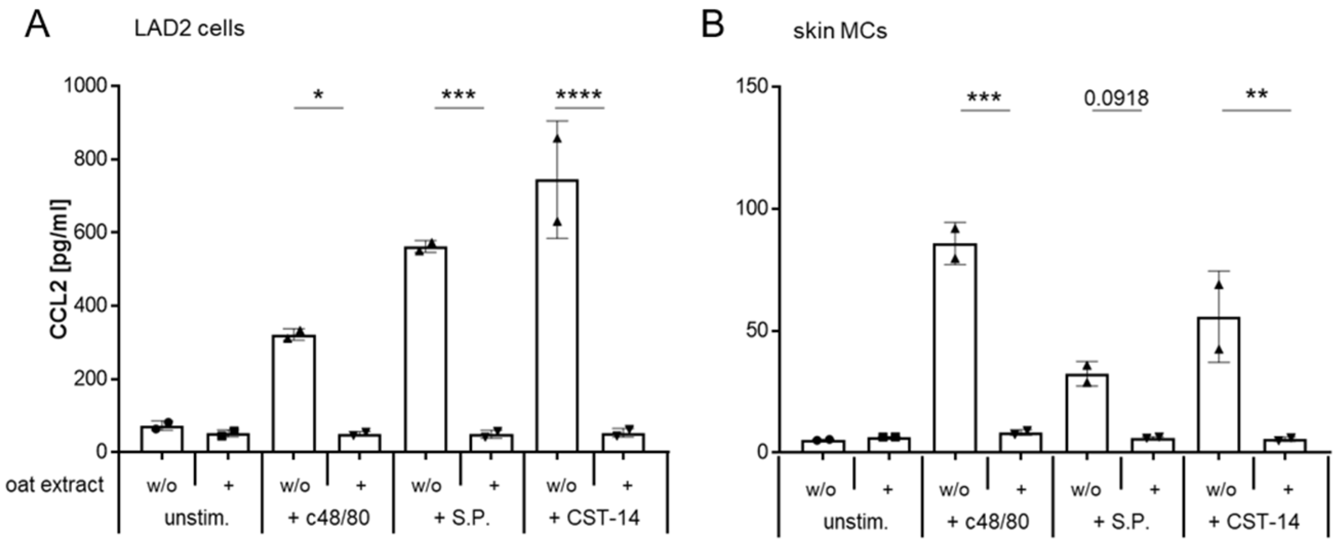 2.6. Oat Extract Inhibits the MRGPRX2-Induced Synthesis of CCL2 in LAD2 Cells and Primary Human Mast Cells